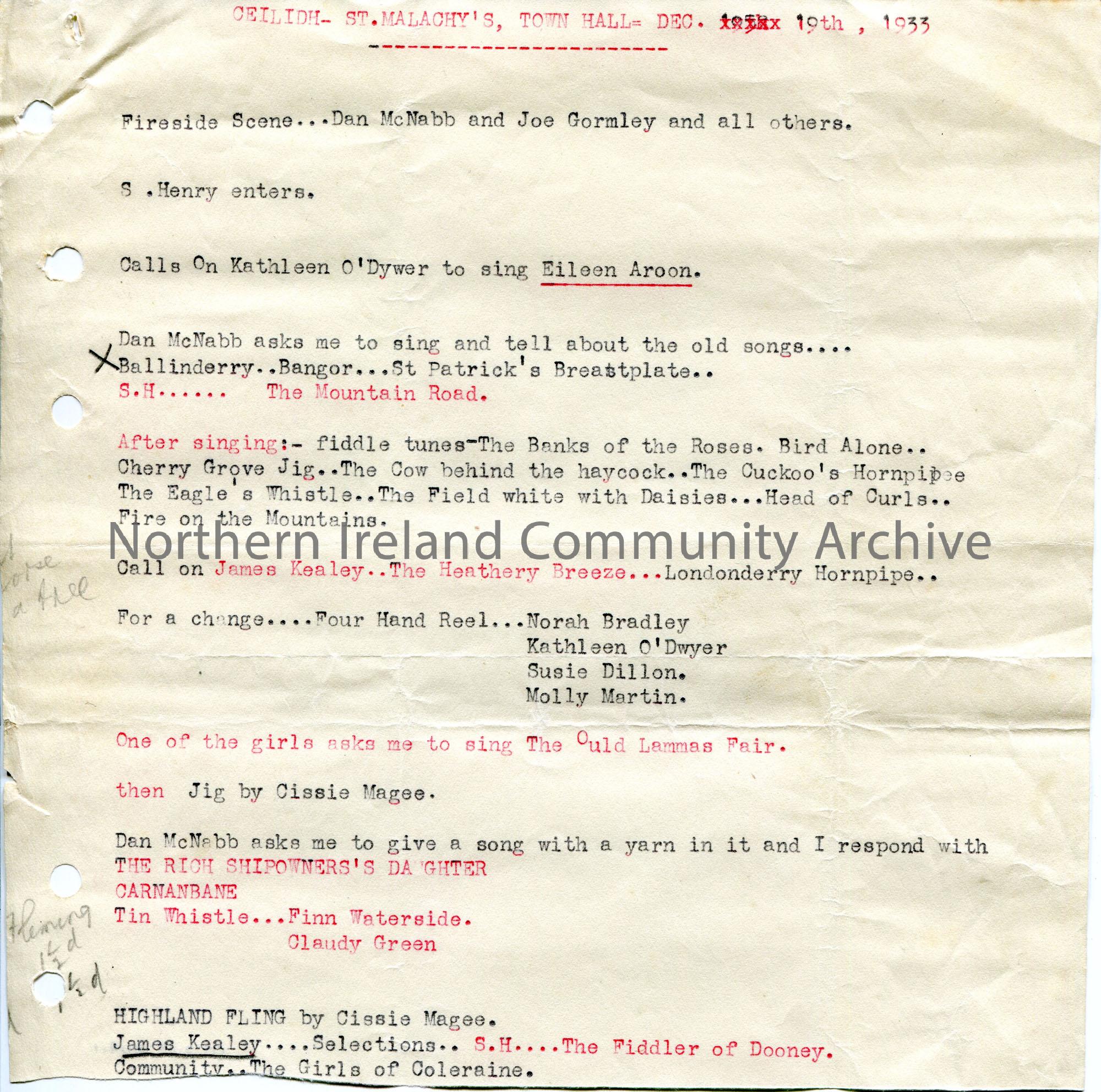 Page 1 of 2. Typed script for an Irish Ceilidh for St. Malachy's Dramatic Club in Coleraine Town Hall, 19th December, 1933. Mentions Dan McNabb, Joe Gormley, Kathleen O'Dwyer, Sam Henry, James Kealey, Cissie Magee. Interspersed with singing, Irish dancing and fiddling.