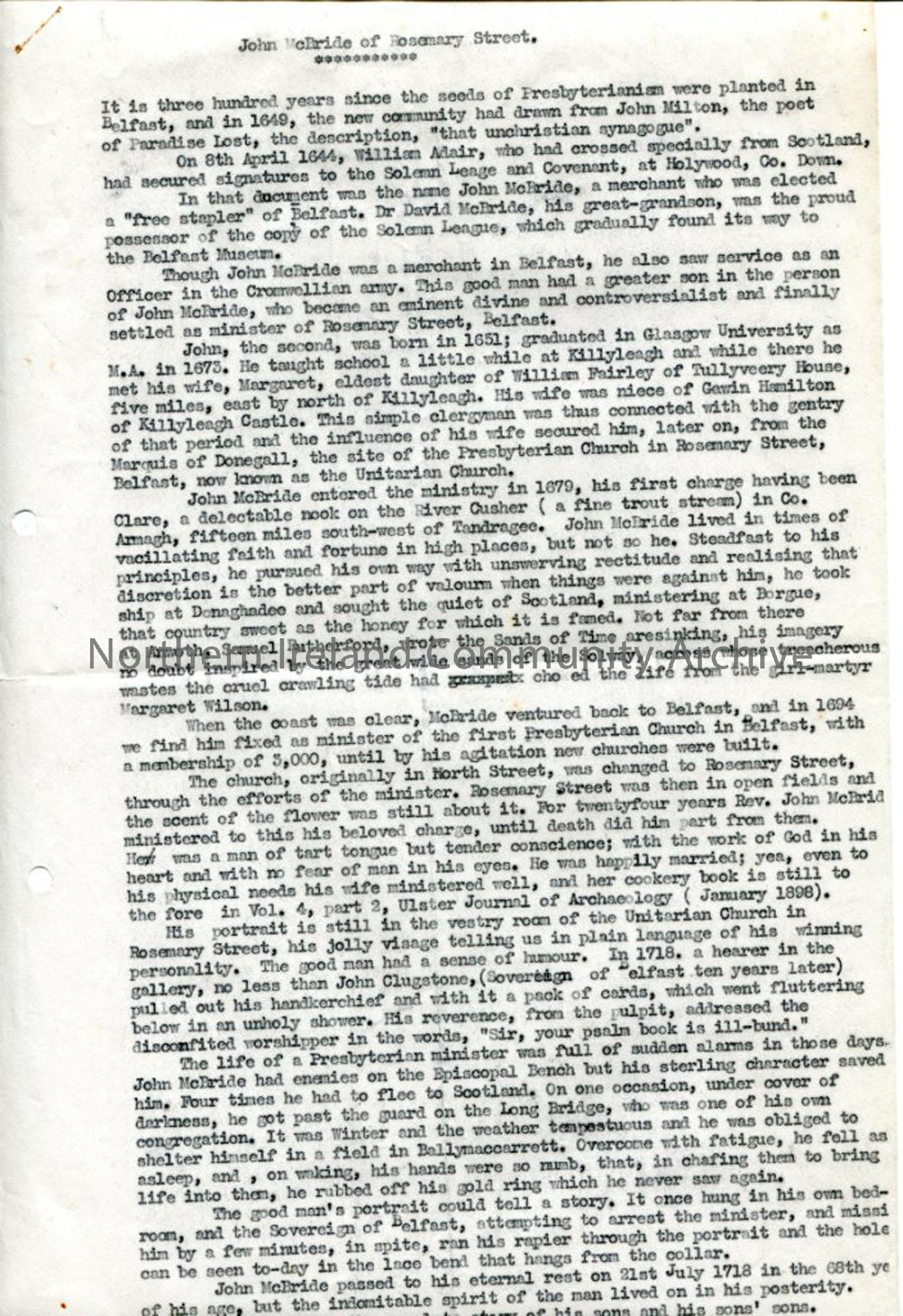Page 1 of 2: Typed script on life of John McBride, 17th century Presbyterian minister in Ulster of Scottish descent and forced to flee to Scotland on several occasions. Genealogical interest as family line followed through - Edgar Allan Poe among descendants.