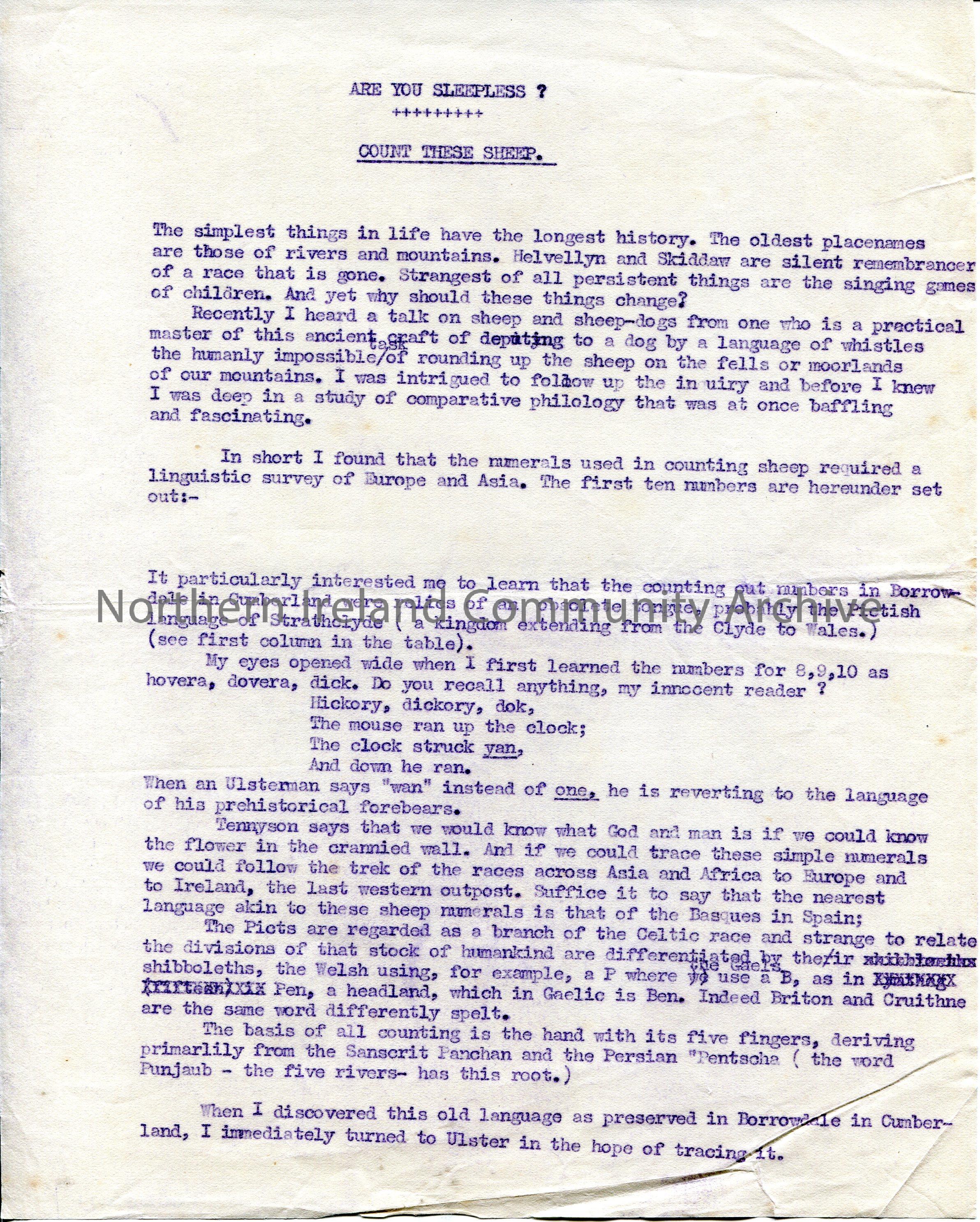 Page 1 of 2. Typed story by Sam Henry titled, 'Are You Sleepless? Count These Sheep'. Re history of numerals used in counting sheep. Refers to a secret language spoken in the Mournes and fairies driven away by the wireless.