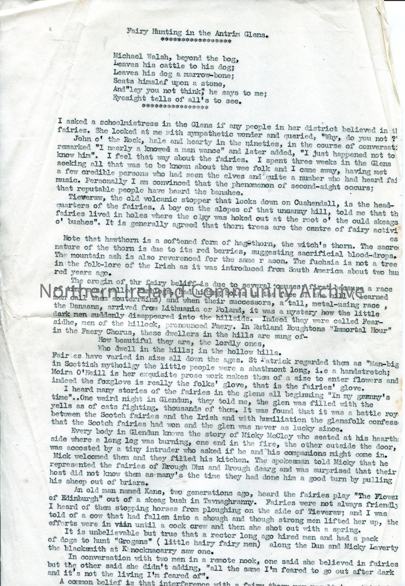 Page 1 of 2. Typed story possibly for talk titled, 'Fairy Hunting in the Antrim Glens'. Sam spent 3 weeks in the Glens learning about the 'wee folk'. Refers to Tieveraw, the headquarters of the fairies, which looks down on Cushendall. Discusses their origin, size, the battle of the Scotch and Irish fairies at Glendun, story of Micky McCloy, fairy thorns.