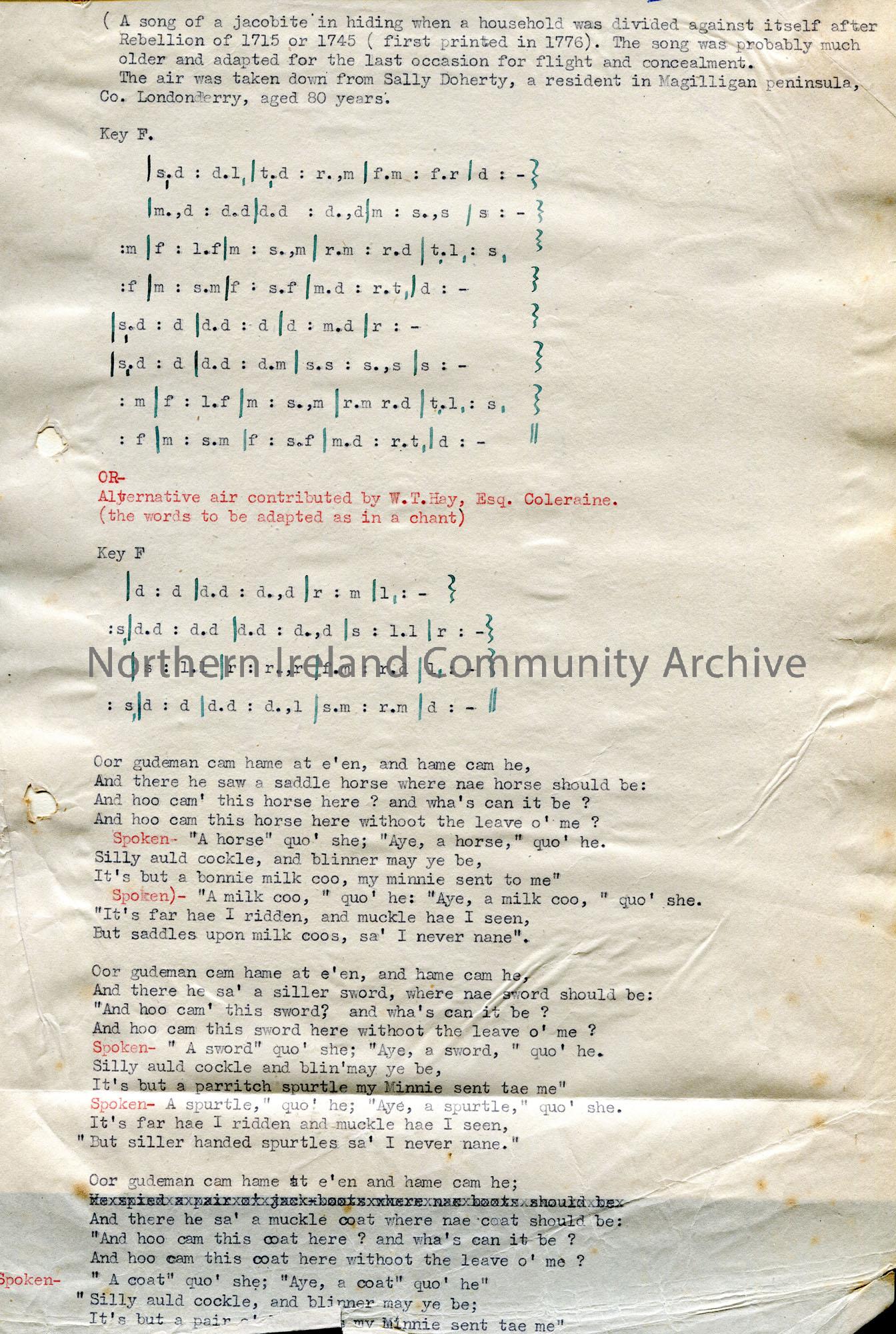 Page 1 of 2. Typed tonic sol-fa notation and word to song titled, 'No. 21 - An Auld Sang in Braid Scots. The Blin' Auld Man or The Covered Cavalier'. Airs taken from Sally Doherty, Magilligan and W. T. Hay, Coleraine. Note of the subject of the song and its age.