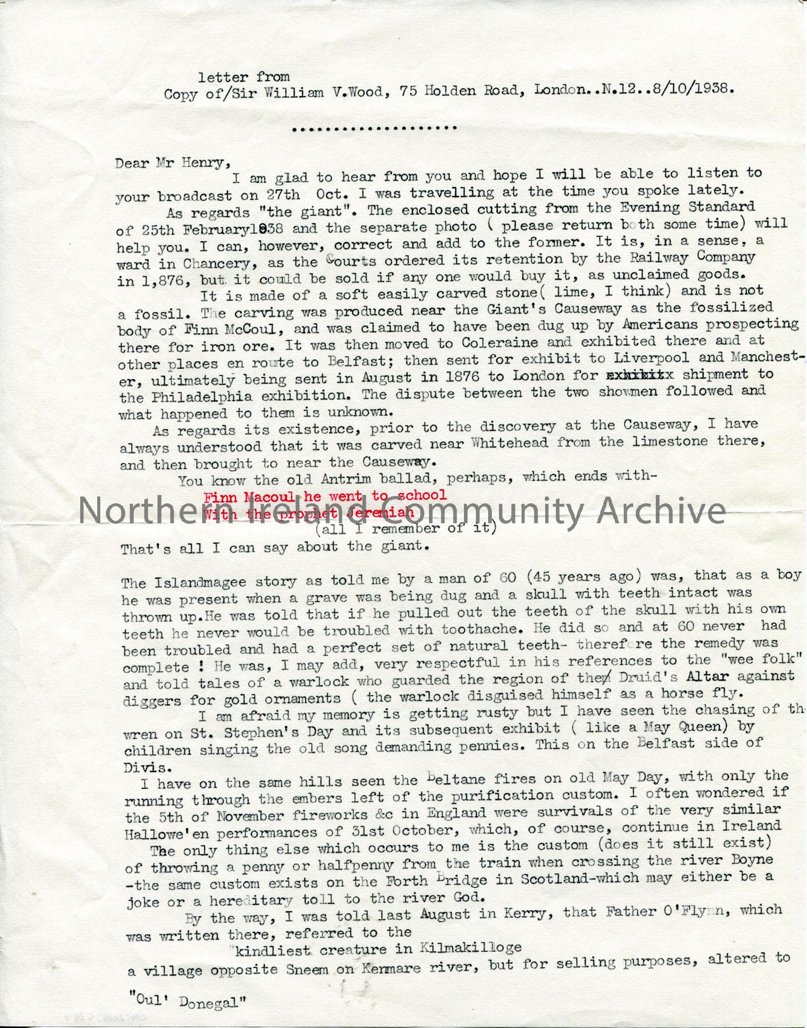 Page 1 of 2. Typed transcript of a letter to Sam Henry from Sir William V Wood. Writing re a piece of carved limestone purported to be the fossilised remains of Finn McCoul - once exhibited in Coleraine and Philadelphia, USA. Refers to an Islandmagee story of a man who never had toothache after pulling teeth from a skull found in a grave; chasing of the wren on St. Stephen's Day [Wren Boys]; Beltane fires on May Day; the old custom of throwing an old penny from a train crossing the River Boyne