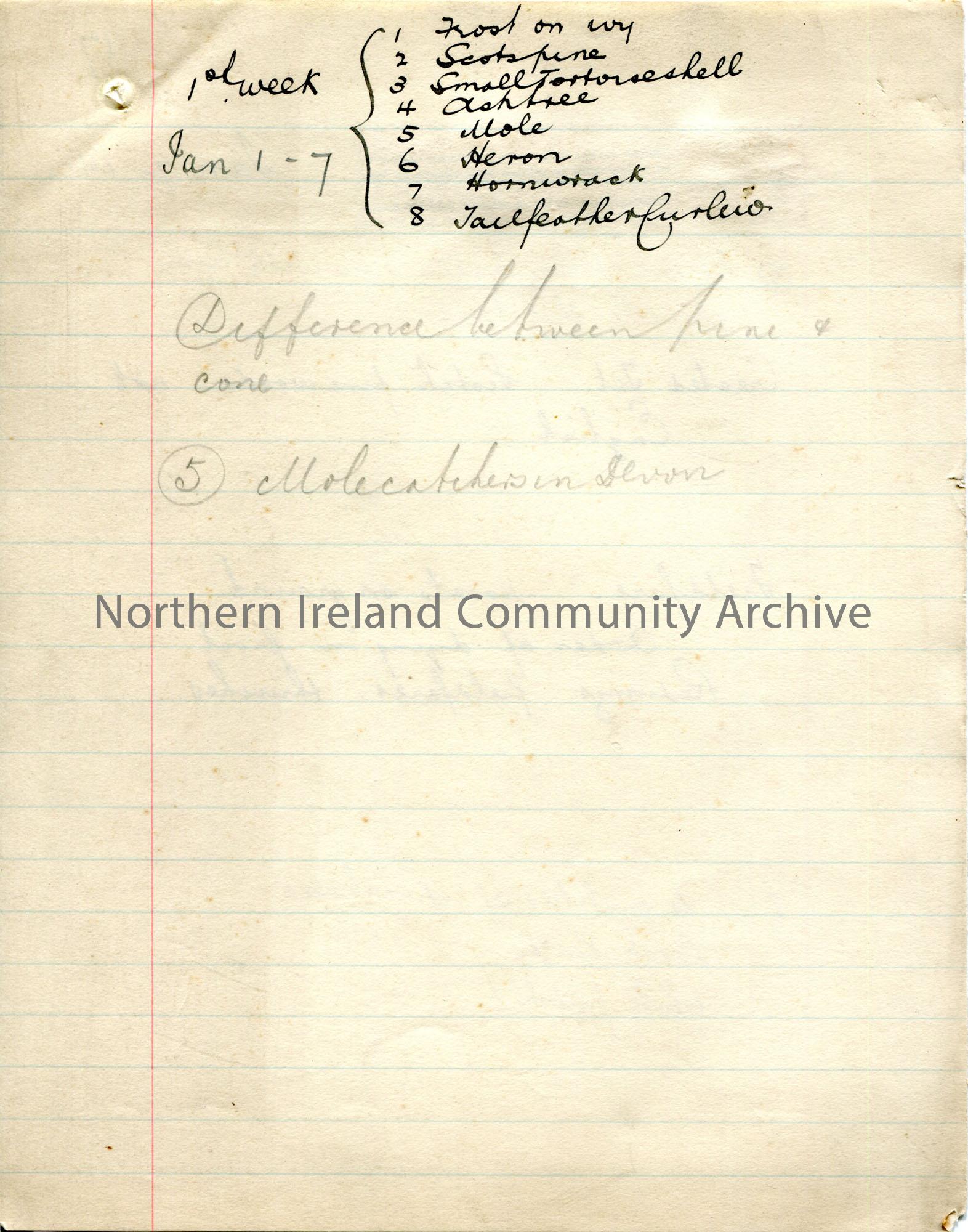 Page 1 of 26. Handwritten nature notes (double sided). Details correspond to each week of the year. Small cuttings from a publication are pasted to so…