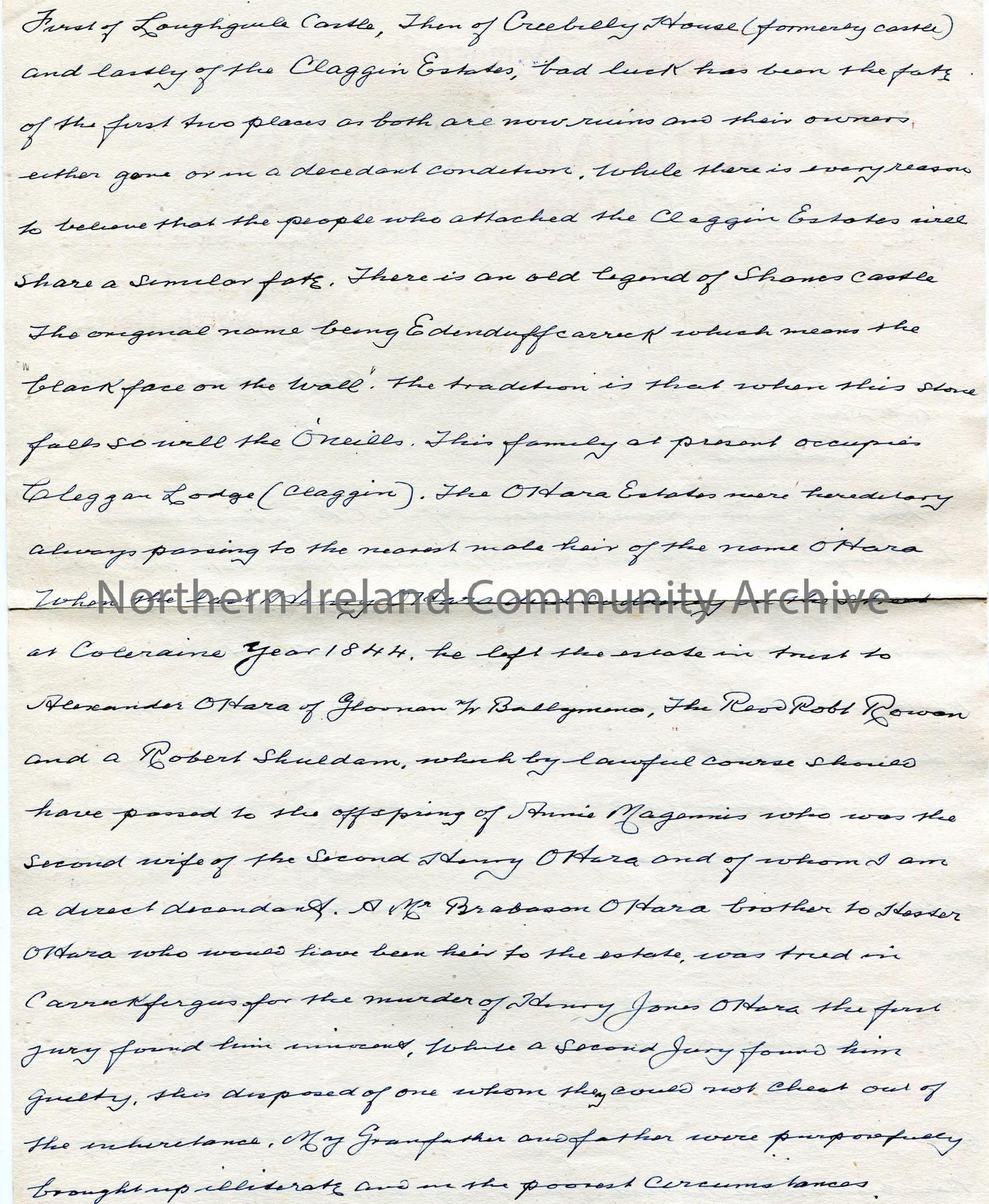 Page 1 of 3. Handwritten letter (double sided) to Sam Henry, Coleraine. Writing re the O’Hara family history. Mentions their previously owned estates … – scan024b