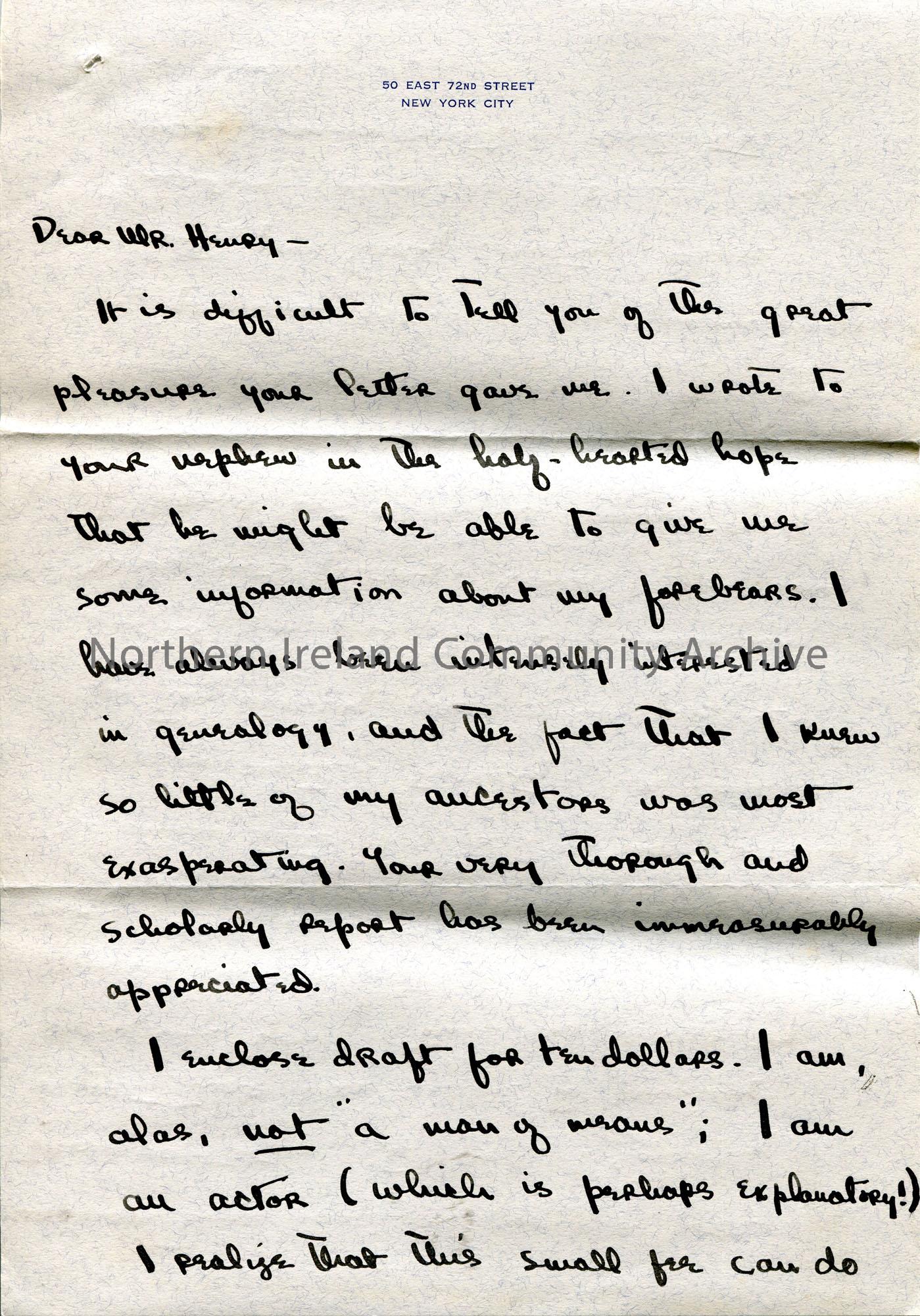 Page 1 of 3. Handwritten letter (double sided) to Sam Henry from John Brewster. Writes of his great appreciation to Sam for his research into the Brewster family and encloses fee of ten dollars. Asks Sam to carry out further research for an additional twenty-five dollars.