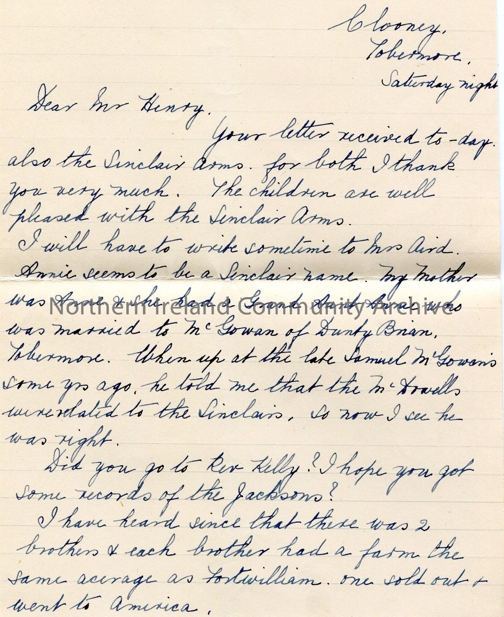 Page 1 of 3. Handwritten letter on lined paper to Sam Henry. Writing re the Sinclair Arms which Sam had sent her. Sam to contact Rev Jackson to get re…