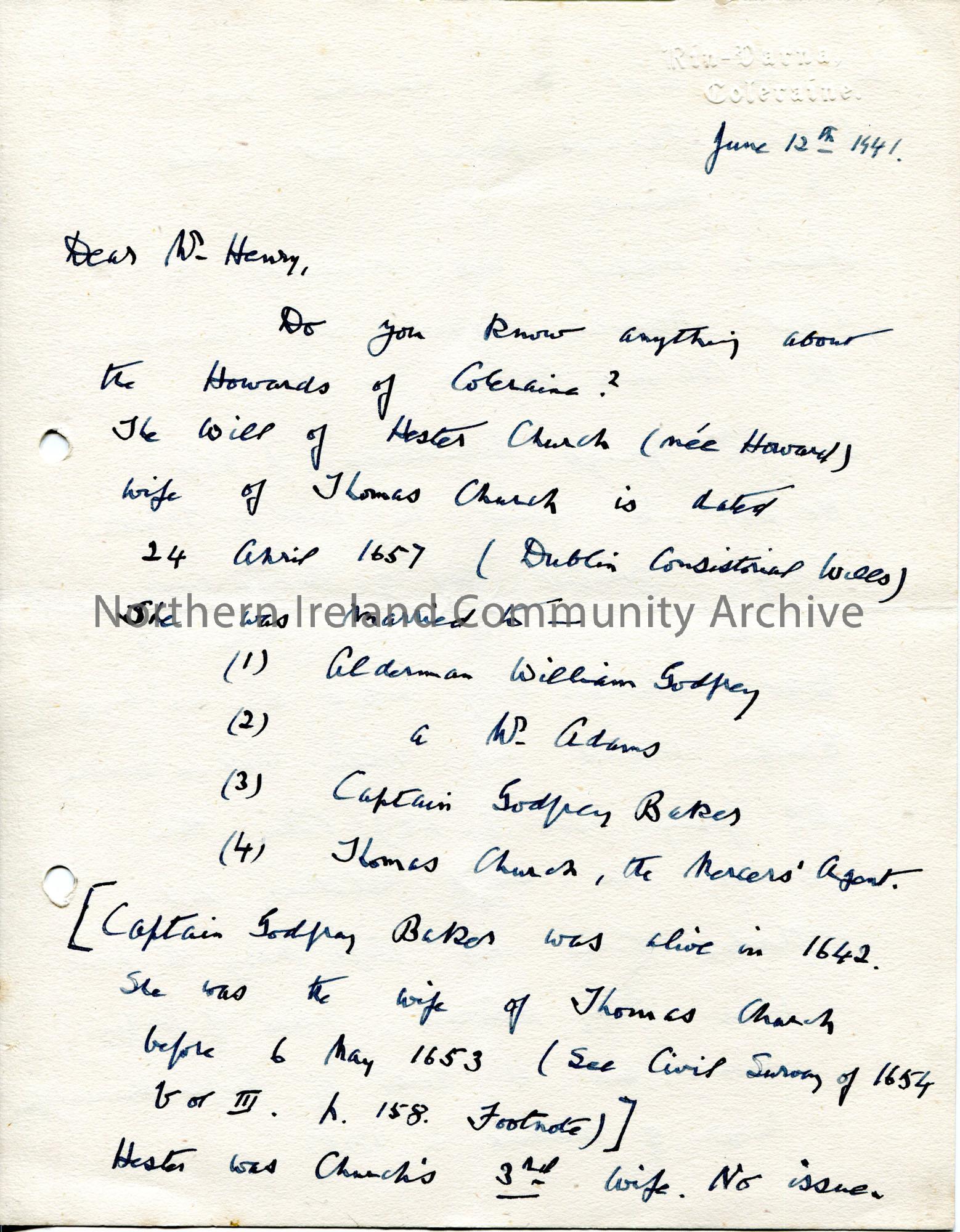 Page 1 of 3. Handwritten letter (page double sided) to Sam Henry from Wilfrid Abbott. Asks Sam if he has any information on the Howards of Coleraine. …
