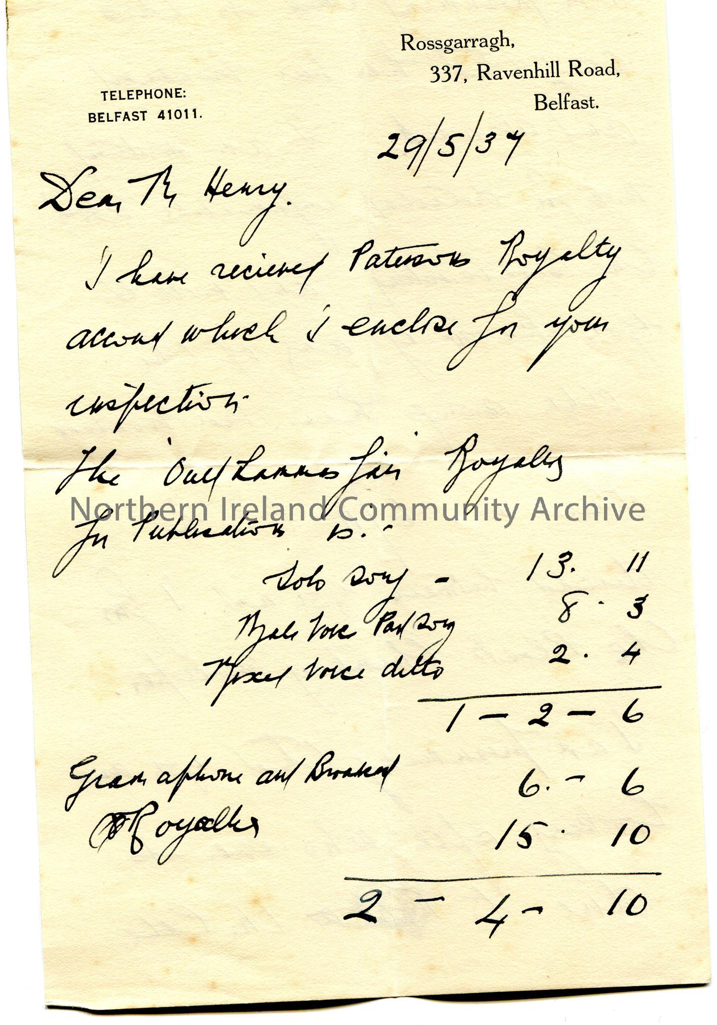 Page 1 of 3. Handwritten letter to Mr Henry. Encloses Paterson’s Royalty Account. ‘The Ould Lammas Fair’ royalties amount to £2-4-10. Asks Sam fo…