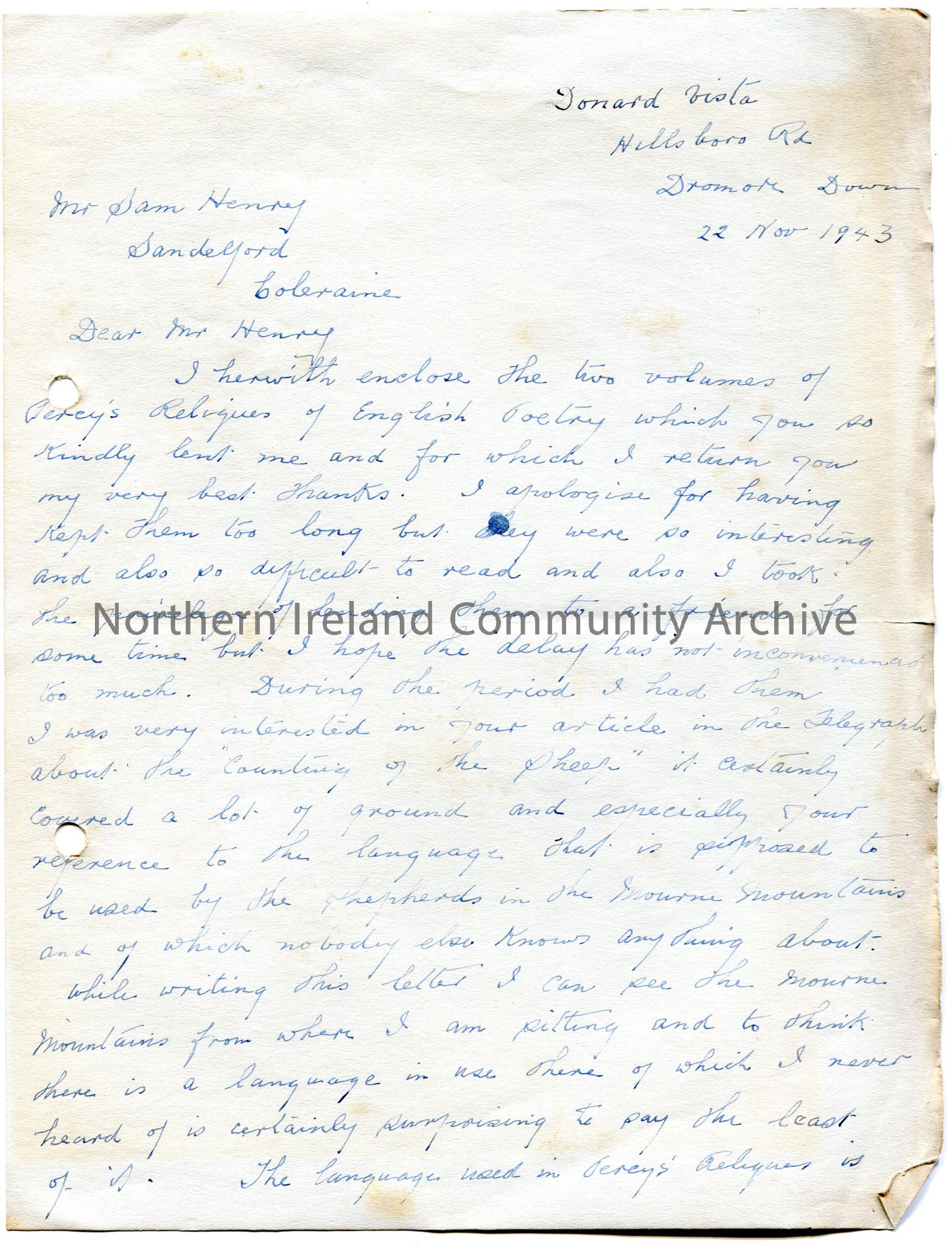 Page 1 of 3. Handwritten letter to Sam Henry, Sandelford, Coleraine. End of letter missing. Returns Sam's two volumes of Percy's Reliques of English Poetry. Writes of his interest in an article of Sam's in the Telegraph titled 'Counting of the Sheep' and the language used by shepherds on the Mourne Mountains. Notes that headstone inscriptions in County Down use the same language as in Percy's book. Writes of the development of the use of 'yea' and 'yip' for 'yes' in the Ulster language and the presence of US soldiers [during World War II]. Writes of the Irish language and its integration into the Ulster language. Discusses the name of Primary School 'Ballyvicknakelly' and its meaning in the Irish language.