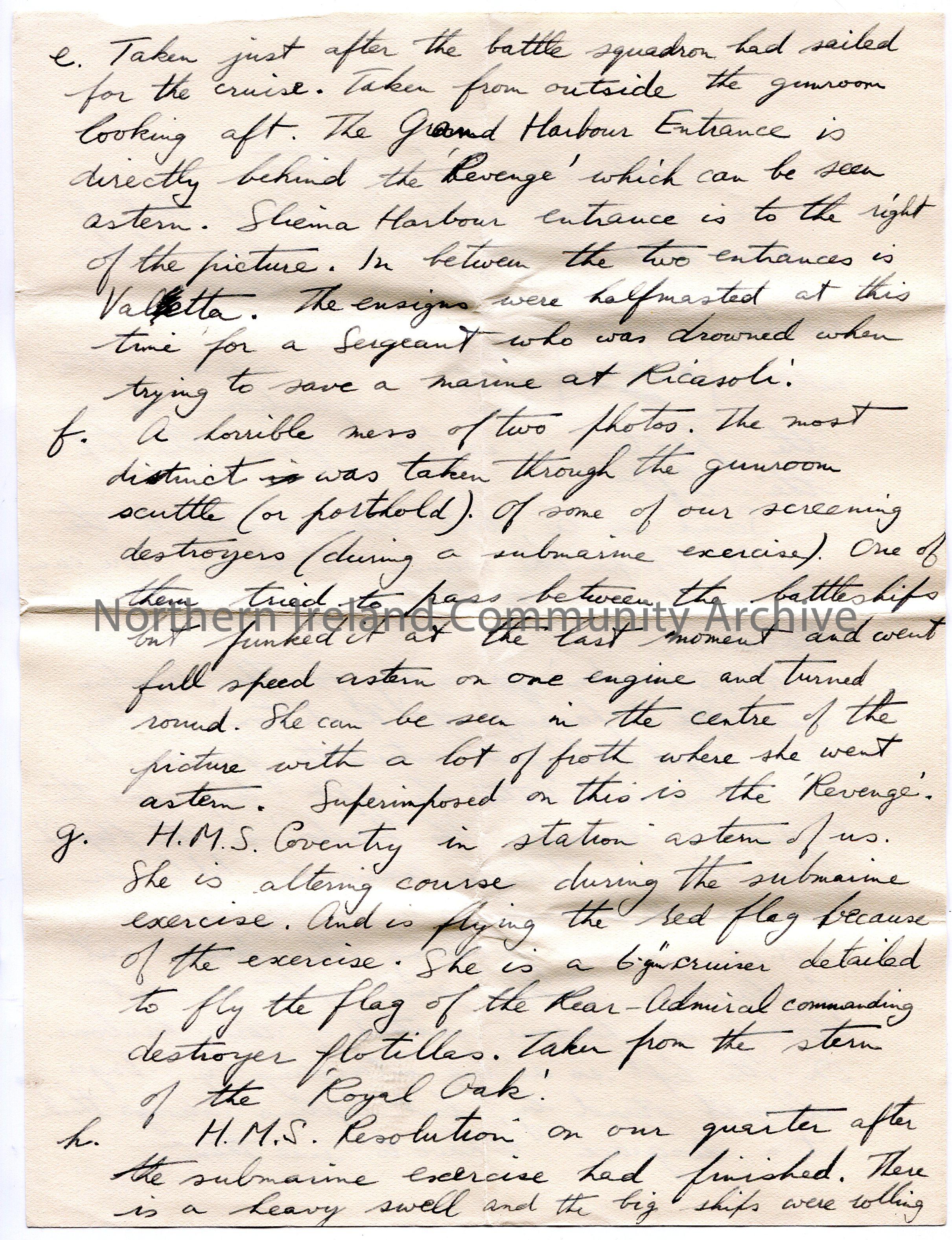 Page 1 of 3. Handwritten list of points a-y to Mrs R K Hezlet of an explanation of photos. Each photograph description appears to feature ships. The w… – scan157b