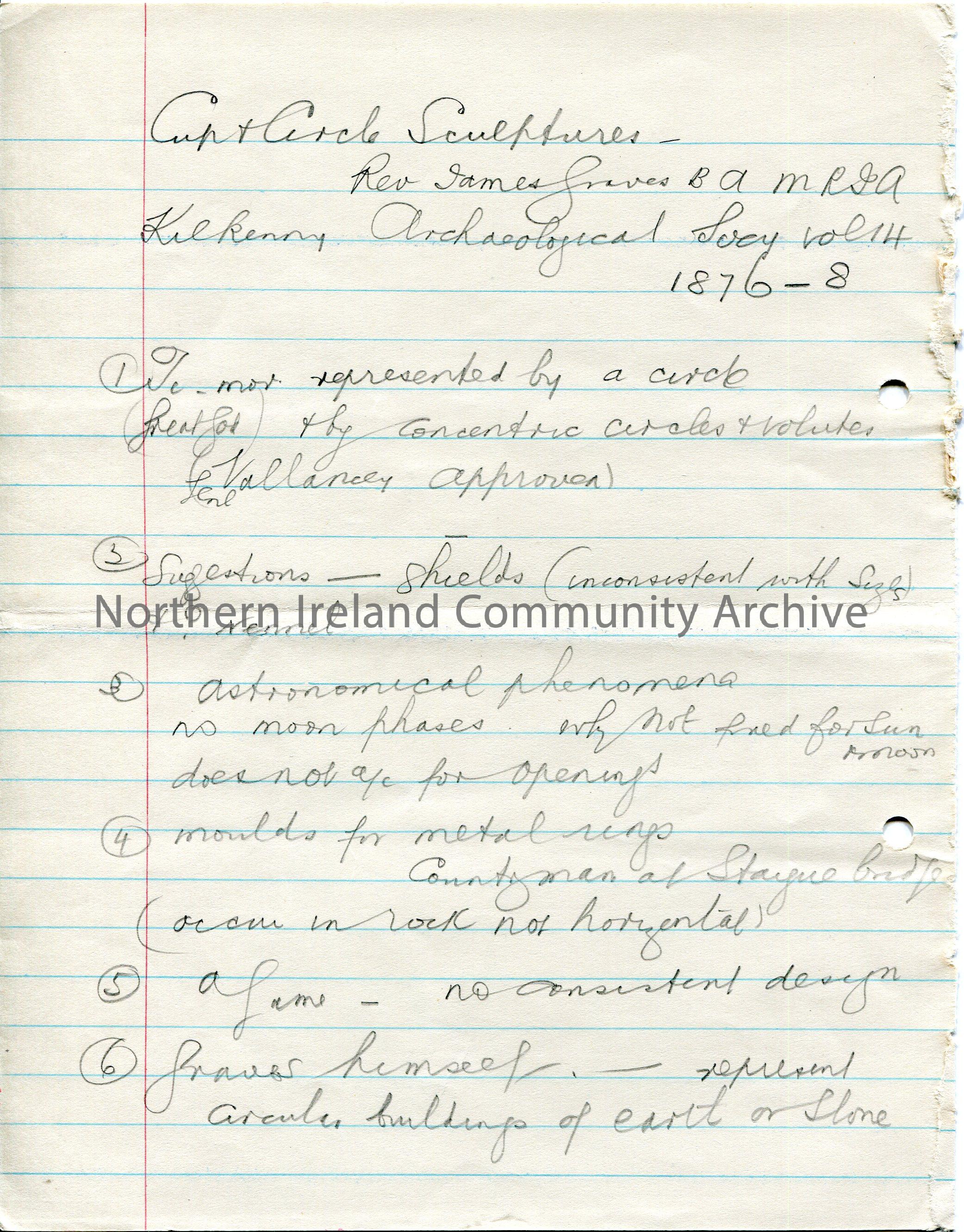 Page 1 of 3. Handwritten notes in pencil on lined paper taken from ‘Cup & Circle Sculptures, Rev. James Graves, Kilkenny, Archaeological Society, Vol….