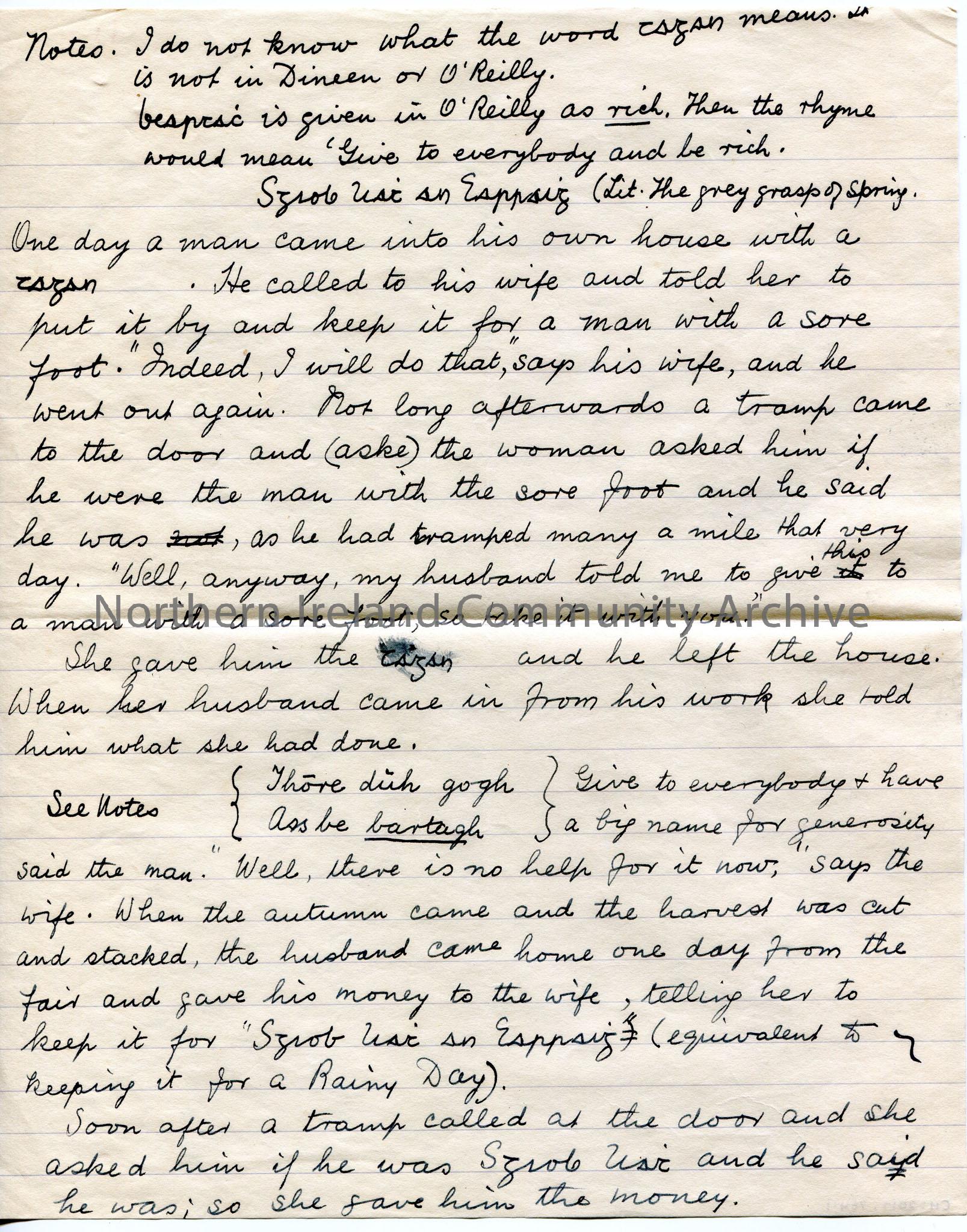 Page 1 of 3. Handwritten story which the writer seems to have translated from Gaelic and is unsure of certain words. Story re a husband and wife and a man with a sore foot. The third page writes as though it is a letter. It states that they have looked up a word in the last page of a book in Dineen. Asks to change the title of the first story and gives thanks for the loan of the book.