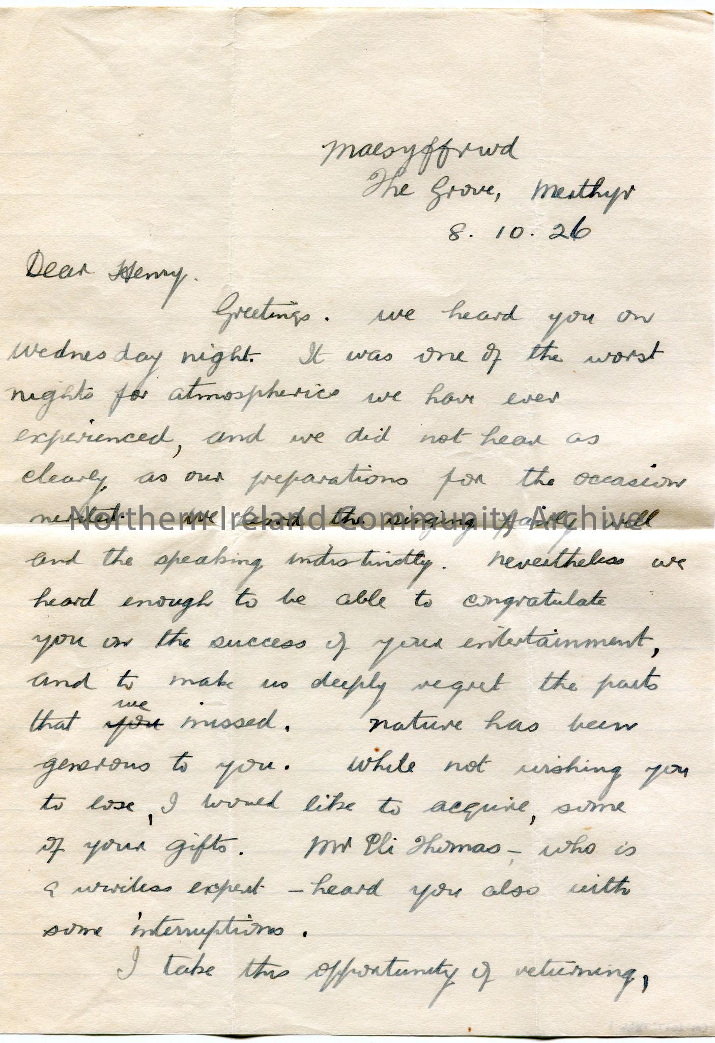 Page 1 of 3 of handwritten letter to Sam Henry. Congratulates Sam’s radio broadcast from Belfast albeit with a poor reception. Thanks Sam for the loan…