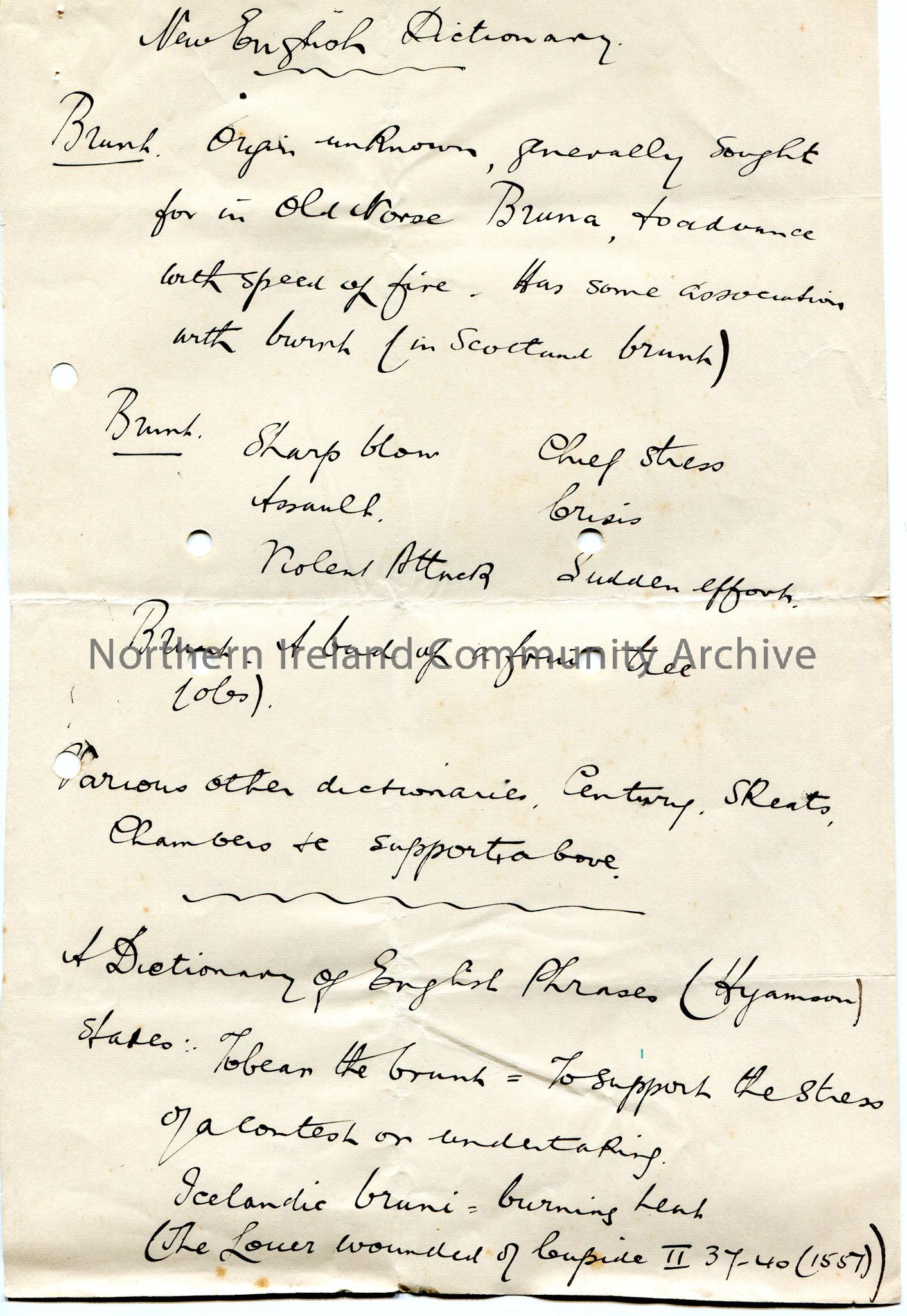 Page 1 of 3 of handwritten notes re words and definitions from the New English Dictionary. Notes the name of a book for searching births, deaths and marriages in Ireland by Robert E Matheson? Refers to the Bronte name. Other words and definitions from English Dialect Dictionary.