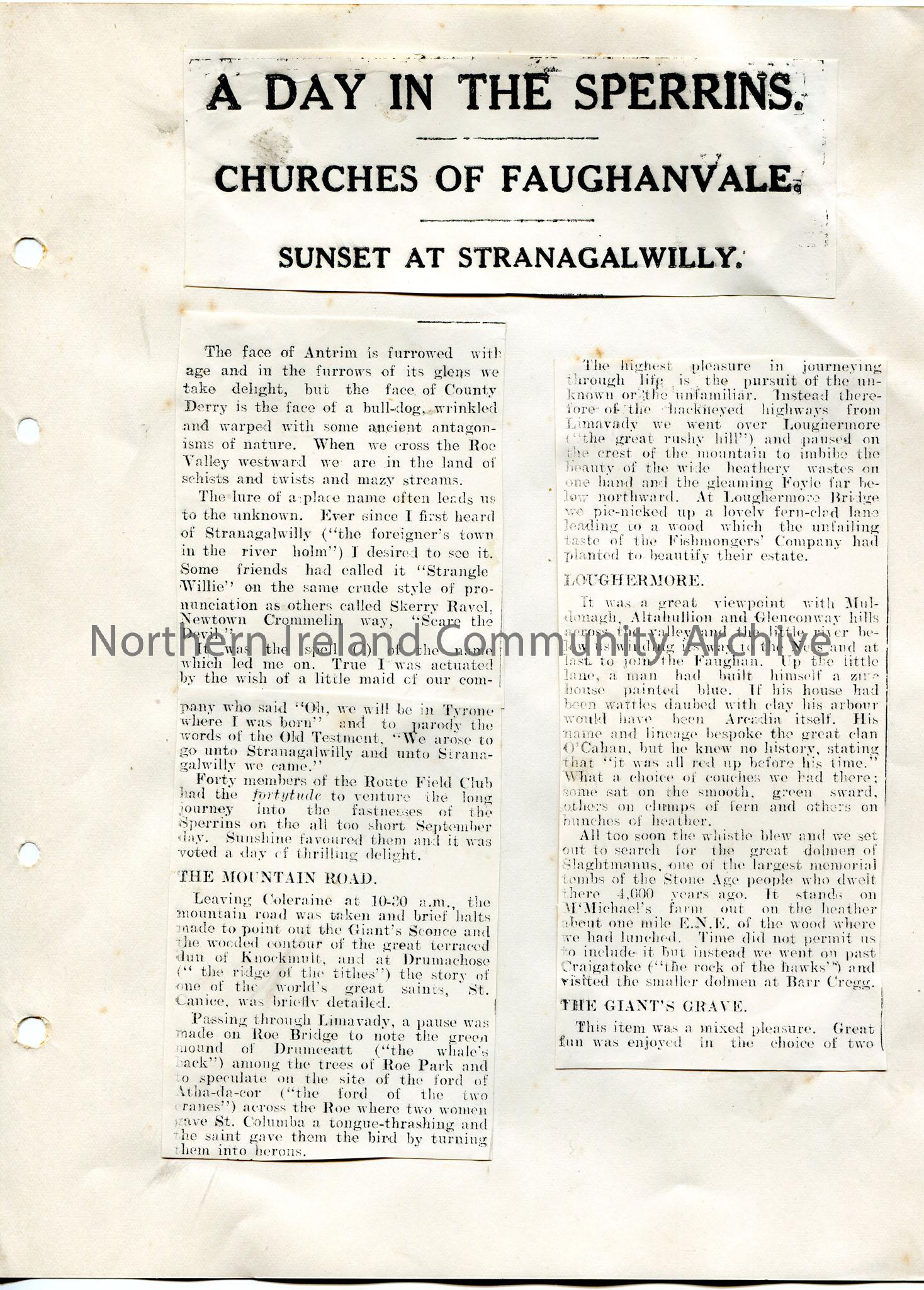 Page 1 of 3 of newspaper cuttings stuck to paper titled, ‘A Day in the Sperrins. Churches of Faughanvale. Sunset at Stranagalwilly.’ Re a trip by the …