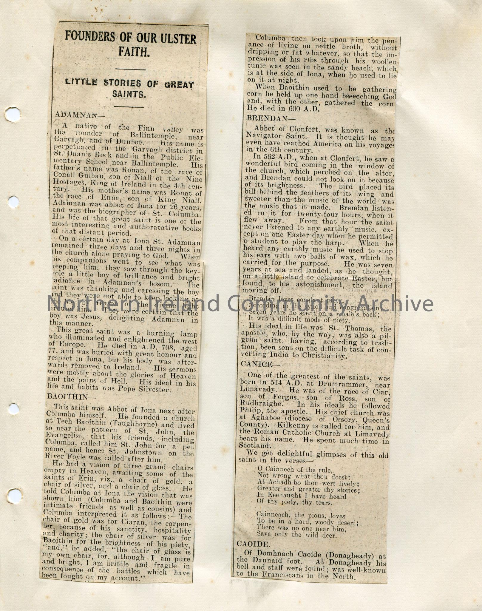 Page 1 of 3 of newspaper cuttings stuck to paper titled, 'Founders of Our Ulster Faith. Little Stories of Great Saints.' Re Saints Adamnan, Baoithin, Brendan, Canice, Caoide and the Great Glasgow Saint.
