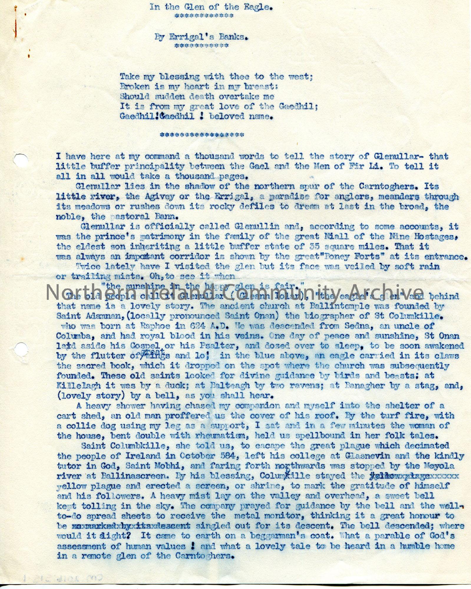 Page 1 of 3 of typed document titled, "In the Glen if the Eagle. By Errigal's Banks". Story of Glenullar. Refers to the names O'Kane and O'Mullan in connection with the Glen. Last page torn from a larger page.