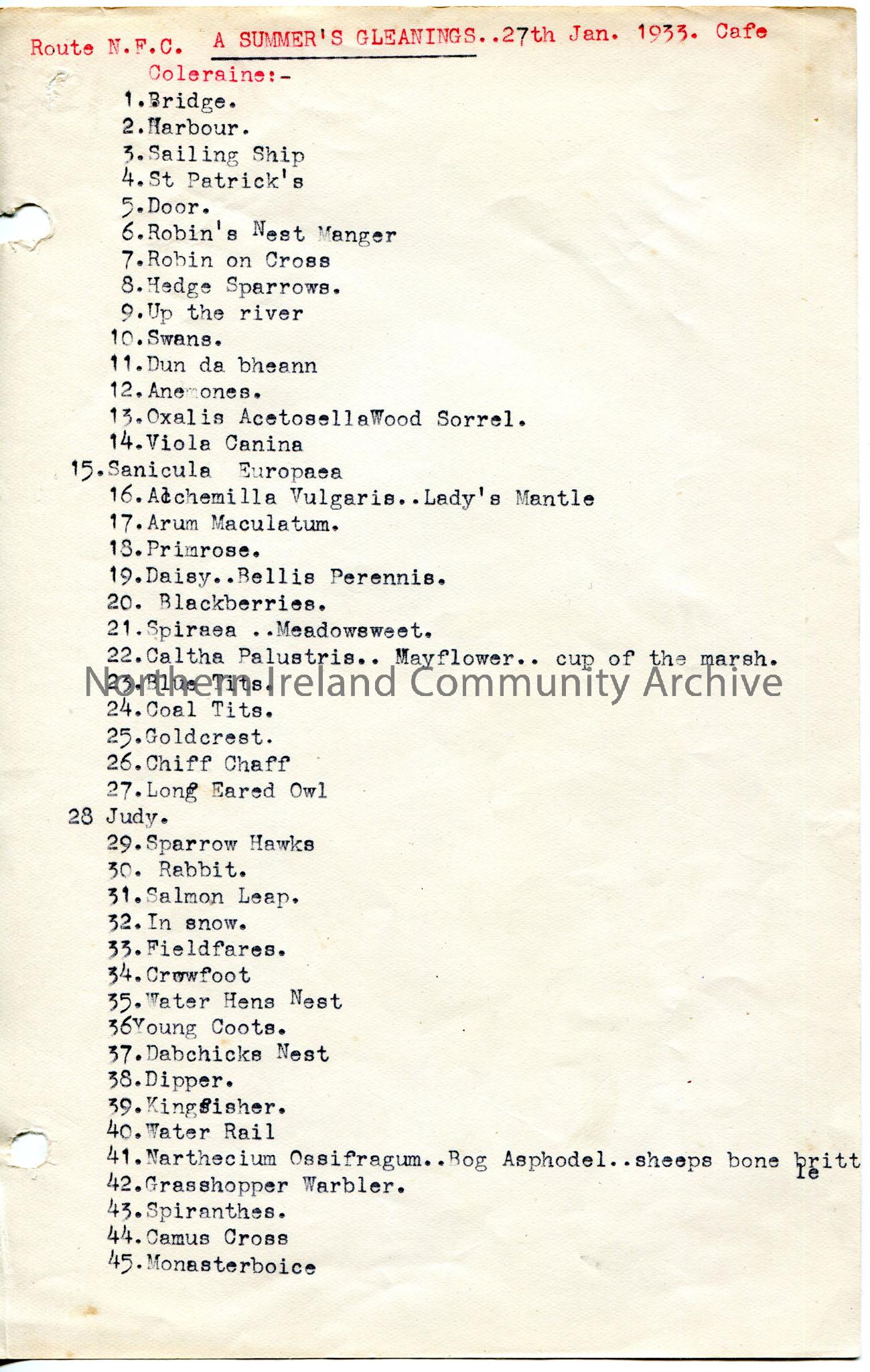 Page 1 of 3 of typed list of names of 135 slides for lecture. Titled, ‘Route N.F.C. A Summer’s Gleanings..27th Jan 1933 Cafe Coleraine’. The names of …