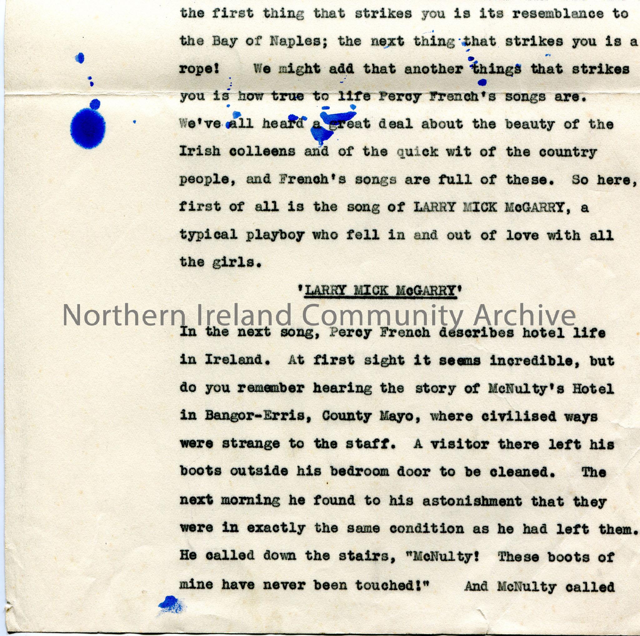 Page 1 of 3 of typed script for broadcast. Re Percy French Programme, The Forces Programme on Thursday 30th May, 1940 at 5.40-6.00pm. Script re Percy French's songs - Phil the Fluter's Ball, Larry Mick McGarry, Mick's hotel, The Emigrant's Letter, Are Ye Right There Michael, Are Ye Right?, Mat Hannigan's Aunt and The Darling Girl From Clare.