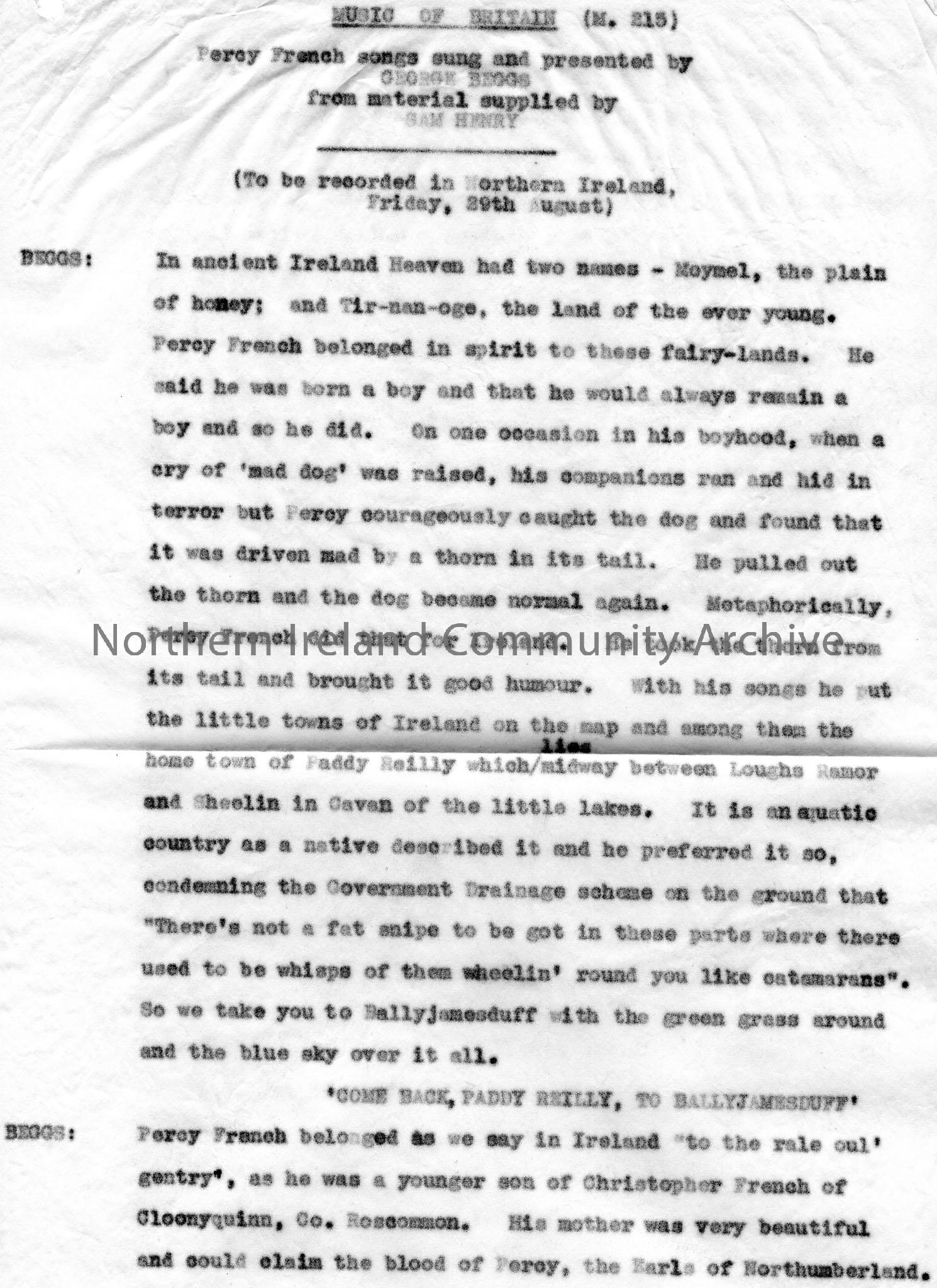 Page 1 of 3 of typed script for broadcast titled, 'Music of Britain. Percy French songs sung and presented by George Beggs from material supplied by Sam Henry'. Script to be recorded in Northern Ireland on Friday 29th August. Script re the songs of Percy Henry.