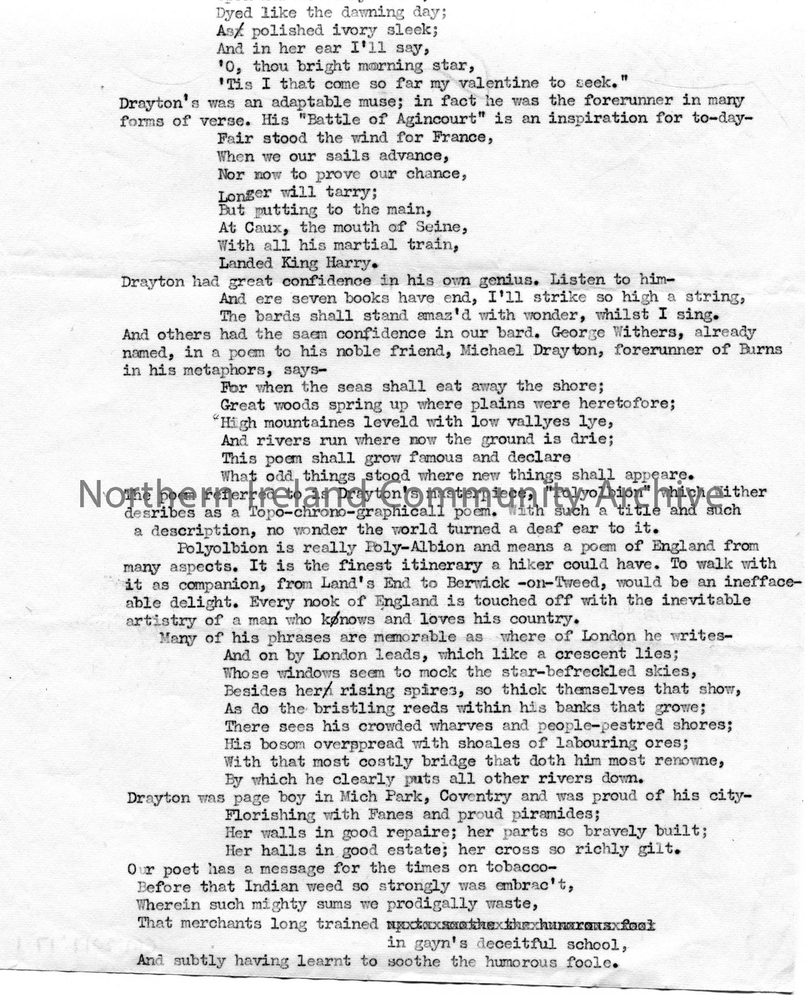 Page 1 of 3 of typed script titled, ‘The Hiker’s Laureate’. Script re Michael Drayton. Descriptive script of his life and work including some of his p… – img032b