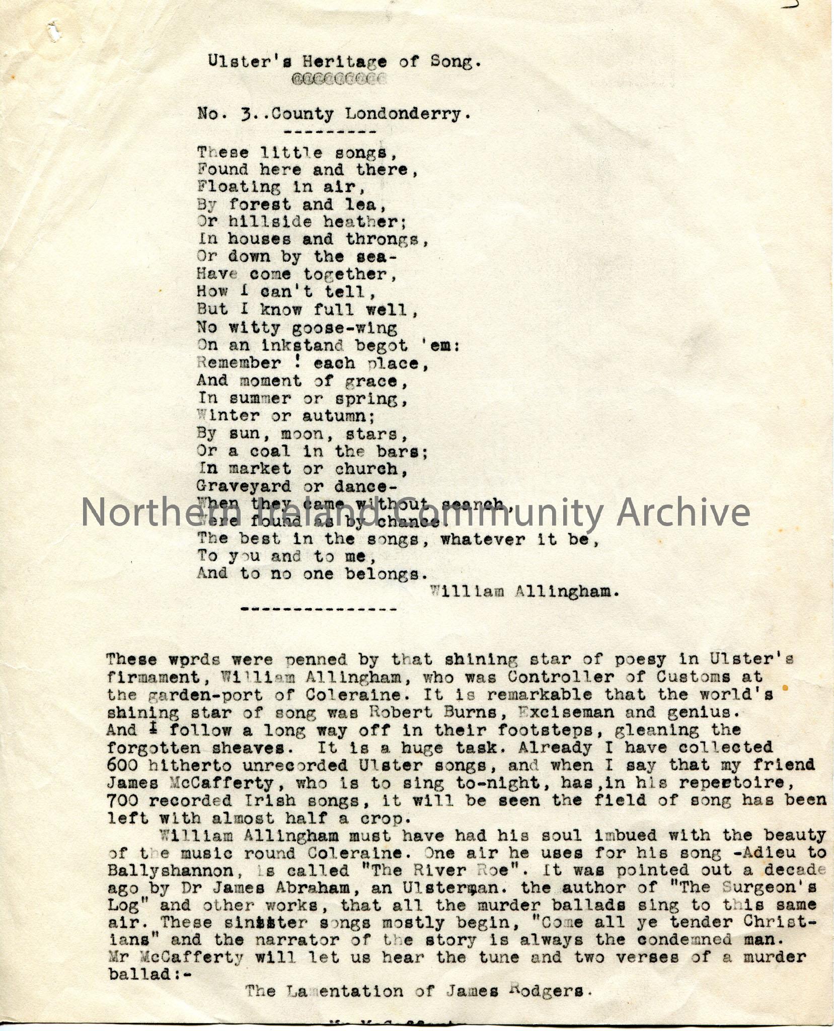 Page 1 of 3 of typed script titled, 'Ulster's Heritage of Song. No 3. County Londonderry.' Number '3' written at top of pages in pencil. Re folksongs and their connection with areas in County Londonderry. Begins with a verse by William Allingham, Controller of Customs at Coleraine's garden-port. Refers to harpists Rory Dall O'Cahan and Denis Hempson; River Roe; Claudy; songs and Coleraine and songs and Aghadowey. Talk features singer James McCafferty. Songs mention the Roe river, Claudy, Londonderry, Garvagh and Slieve Gallions Braes.