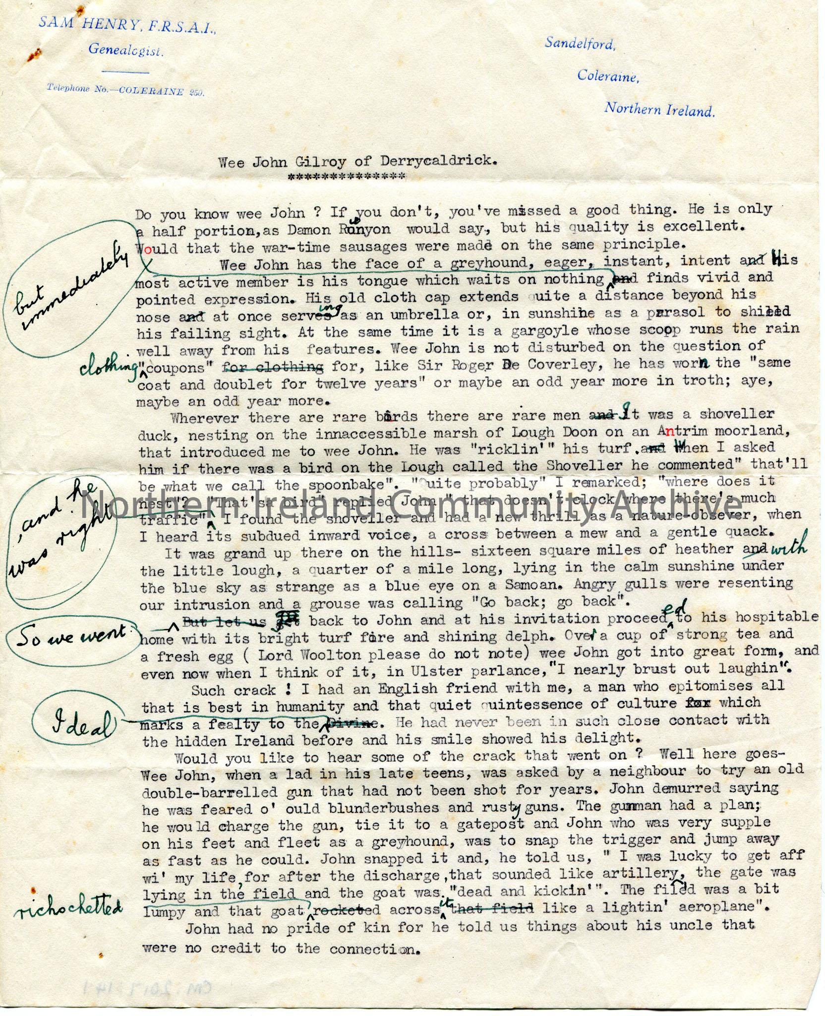 Page 1 of 3 of typed story on headed paper titled, 'Wee John of Derrycaldrick'. Pages are annotated. 'Note. The personal placenames are fictitious'. Signed Sam Henry.
