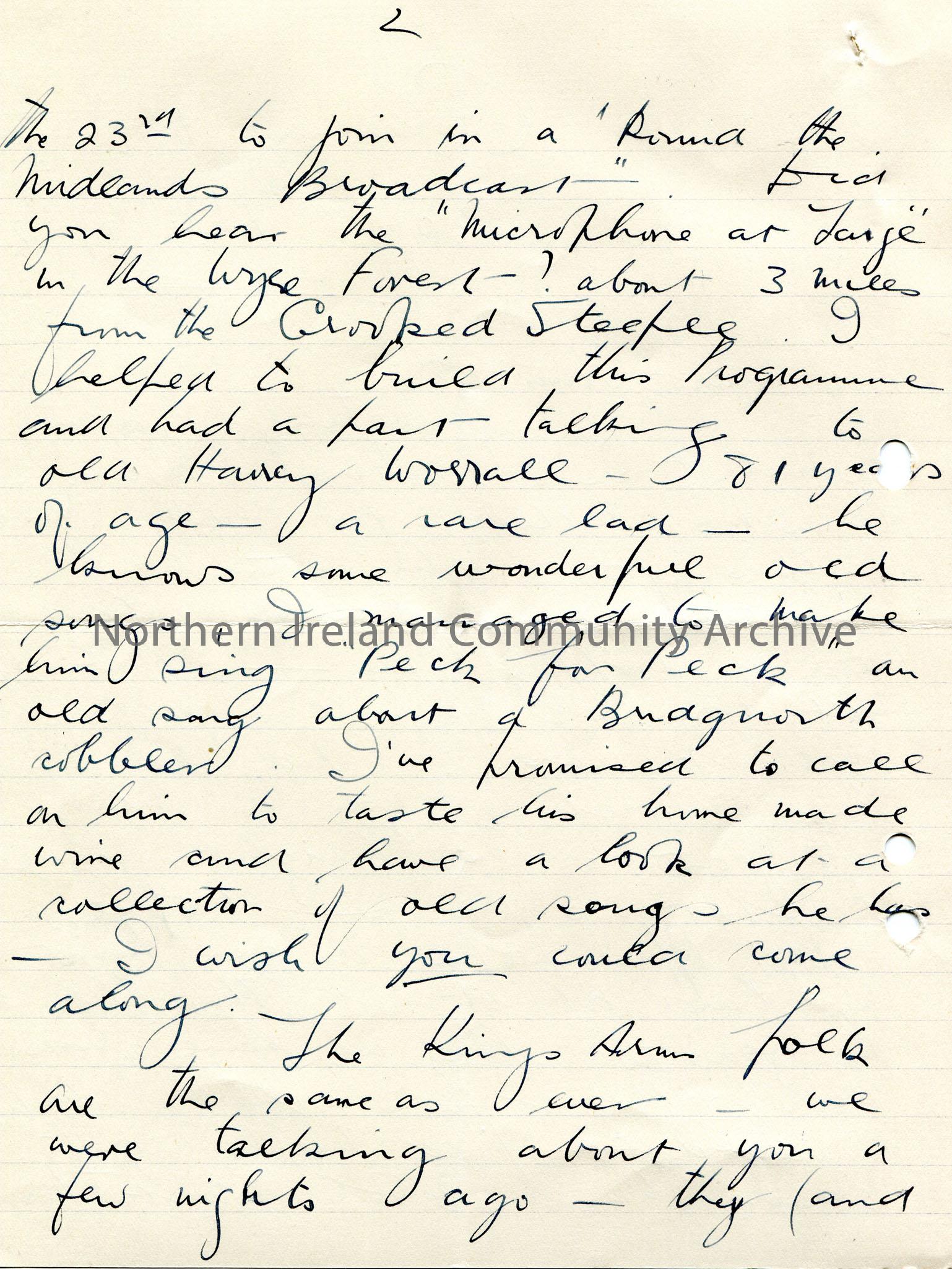 Page 1 of 3 pages, double sided, of handwritten letter to Sam Henry. Thanks Sam for good wishes for Christmas. Wishes Sam a Happy New Year. Writes it has been busy at the post office where he works. Went to Birmingham B.B.C on 23rd December to join a 'Round the Midlands' broadcast. Asks Sam if he has heard the 'Microphone at ?' programme. Evans had part in it talking to Harvey Wossall? who sang 'Peck the Peck' an old song about a cobbler and who Evans plans to meet up with to look at collection of songs.Thanks Sam for card of B.B.C appointments. Writes that he got engaged to Doris (Dot) Aldridge from Cotswold and a B.B.C folk song singer. Talks of a dinner in the Kings Arms on 13th January in which in publisher will be there. Hopes to have a collection of essays and character sketches ready to give to publisher. States that Father Rope has moved to the English College, Rome.