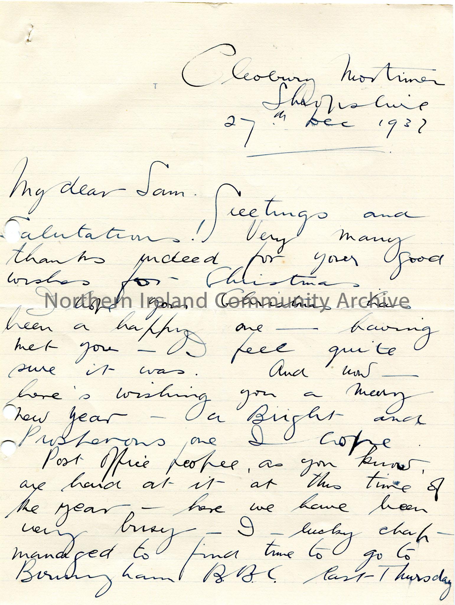 Page 1 of 3 pages, double sided, of handwritten letter to Sam Henry. Thanks Sam for good wishes for Christmas. Wishes Sam a Happy New Year. Writes it has been busy at the post office where he works. Went to Birmingham B.B.C on 23rd December to join a 'Round the Midlands' broadcast. Asks Sam if he has heard the 'Microphone at ?' programme. Evans had part in it talking to Harvey Wossall? who sang 'Peck the Peck' an old song about a cobbler and who Evans plans to meet up with to look at collection of songs.Thanks Sam for card of B.B.C appointments. Writes that he got engaged to Doris (Dot) Aldridge from Cotswold and a B.B.C folk song singer. Talks of a dinner in the Kings Arms on 13th January in which in publisher will be there. Hopes to have a collection of essays and character sketches ready to give to publisher. States that Father Rope has moved to the English College, Rome.