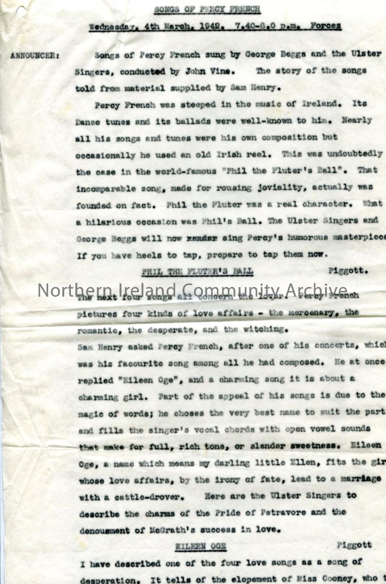 Page 1 of 3: Typed BBC script about Percy French, incorporating material supplied by Sam - 'Phil the Fluter'. Dated 4.3.1942.