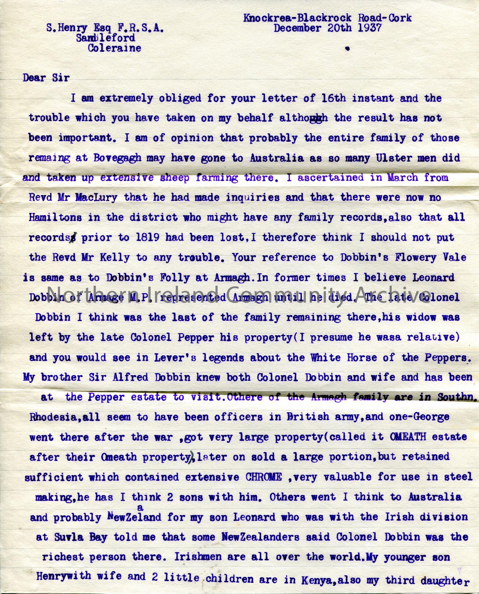 Page 1 of 3. Typed letter to Sam Henry from Leonard Dobbin. Gives an overview of his childhood and how he came to live in Cork.