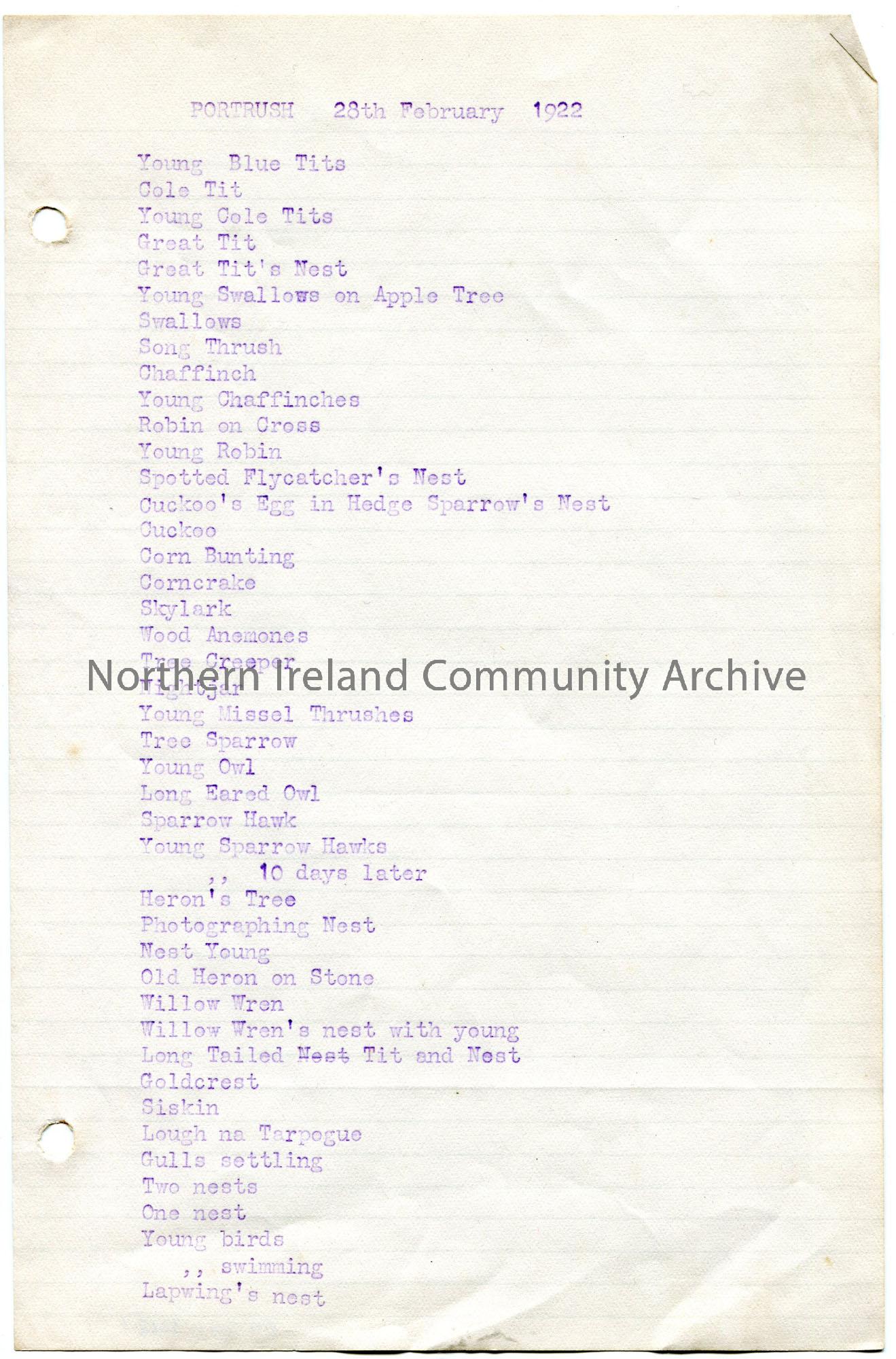 Page 1 of 3. Typed list of bird names - most likely of slides for a lecture or talk - in Portrush on 28th February 1922. Begins with Young Blue Tits and ends with Lapwing's nest on page 1.