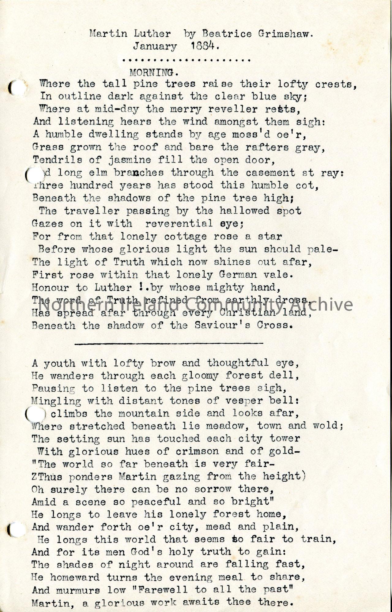 Page 1 of 3. Typed poem ‘Martin Luther’ by Beatrice Grimshaw, January 1884. Written in 3 sections – morning, noon and night.