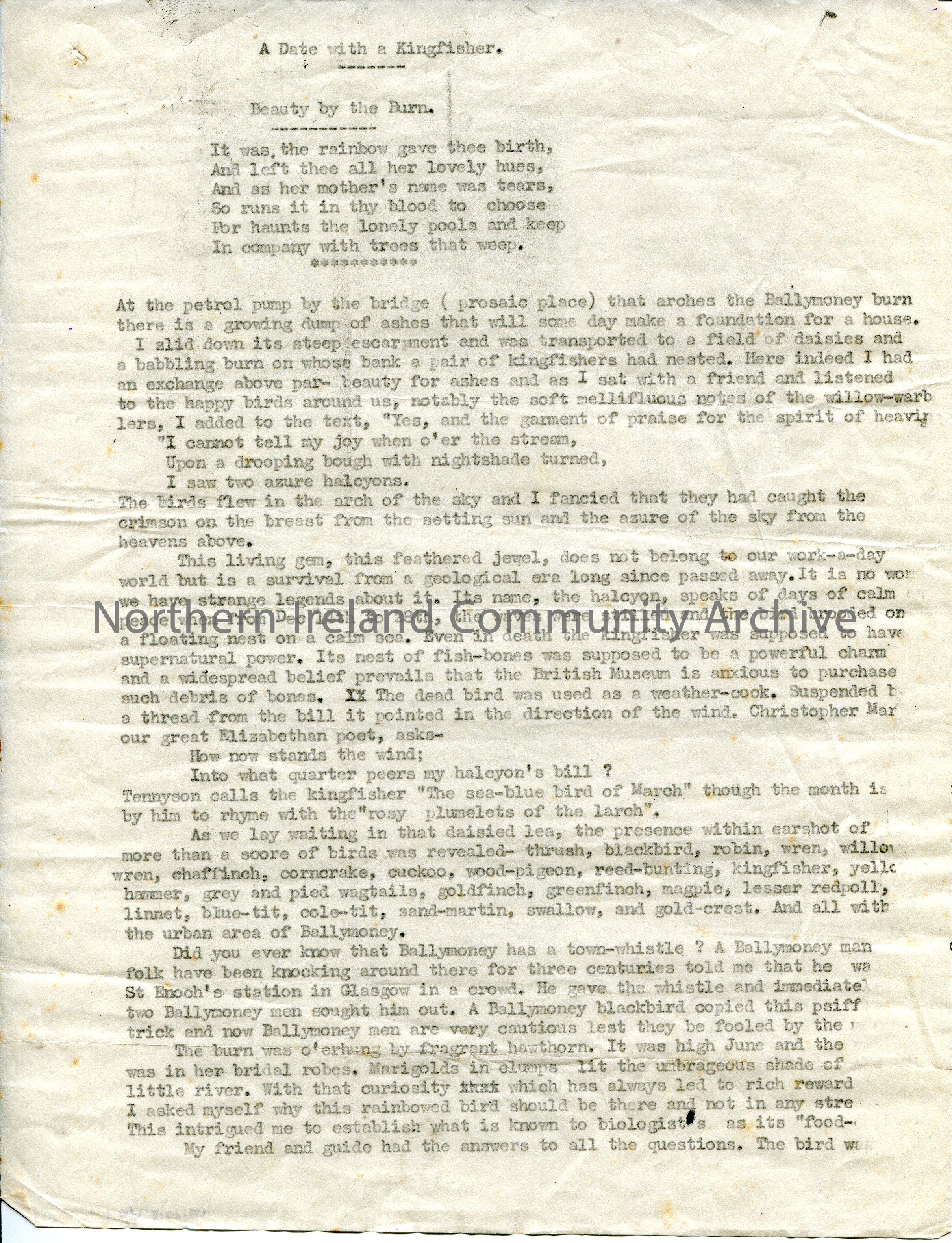 Page 1 of 3. Typed story by Sam Henry titled, ‘A Date with a Kingfisher’.