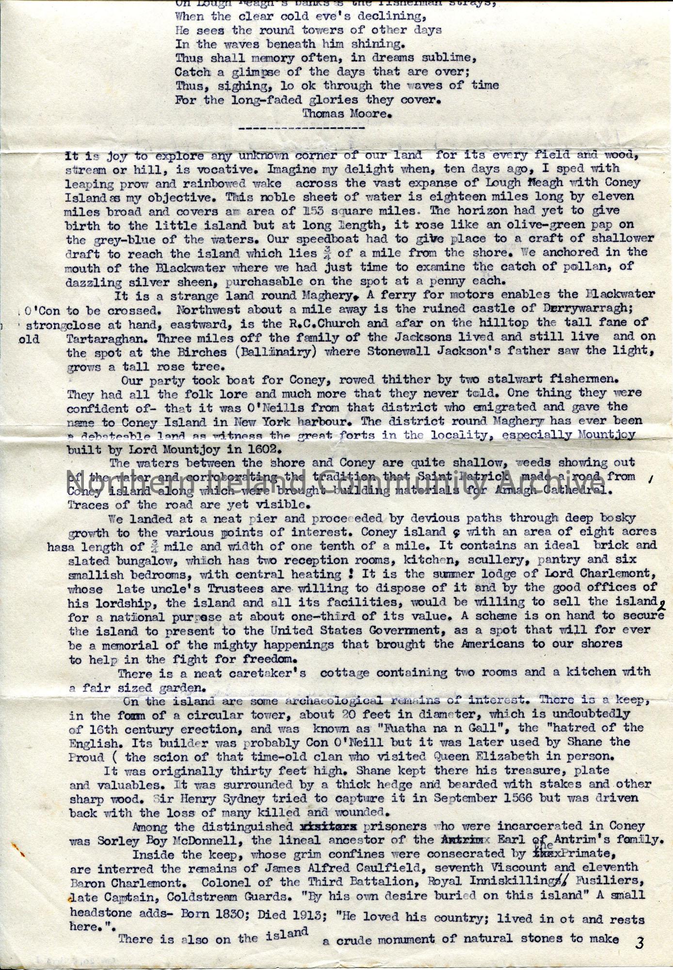 Page 1 of 3. Typed story for an article. Titled, 'Ulster's Coney Island'. Begins with poem by Thomas Moore re Lough Neagh. Story re a visit to Coney Island by Sam Henry. Gives a description of the island and details its history.