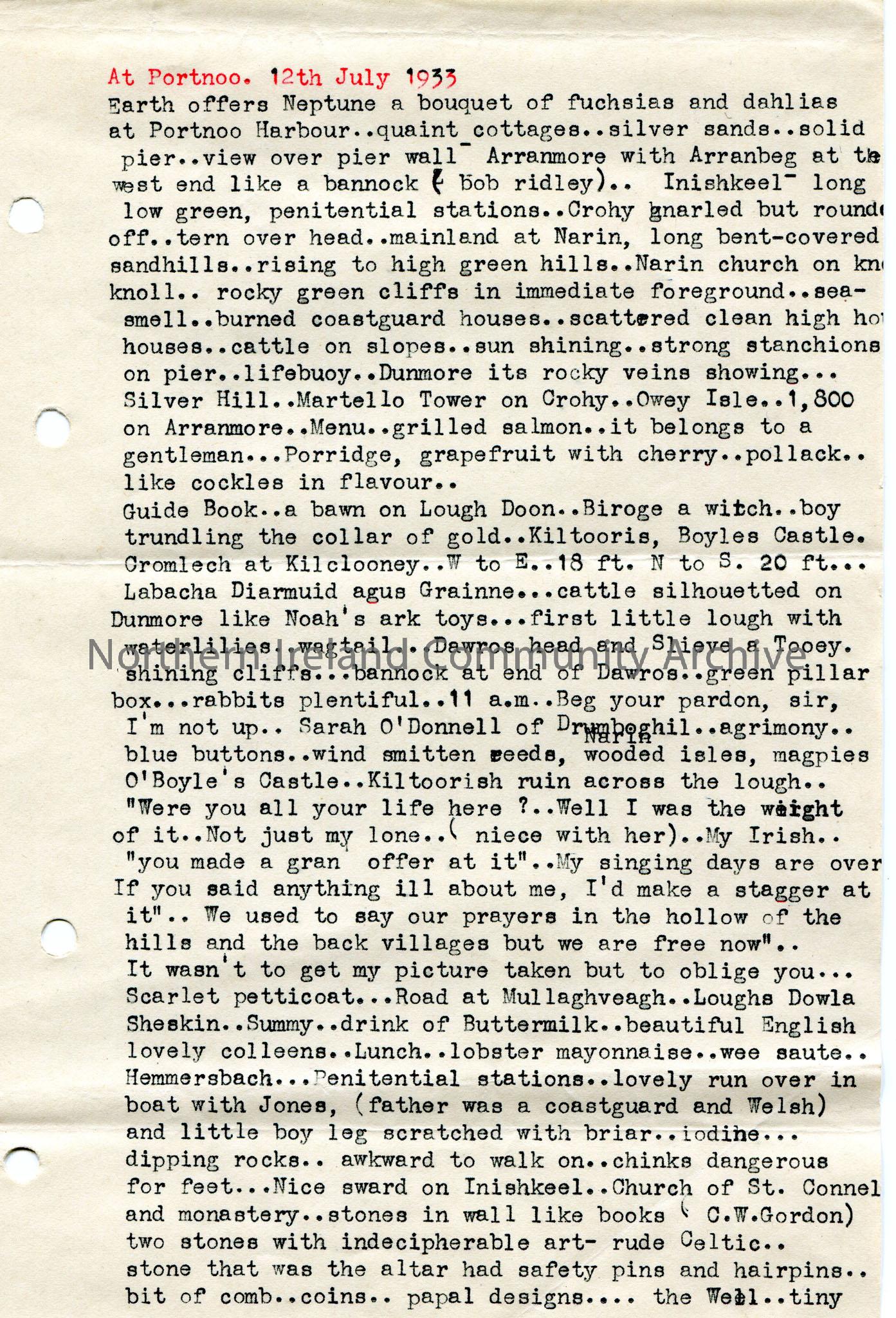 Page 1 of 3. Types notes re At Portnoo. 12th July 1933 and St. Niall's well.