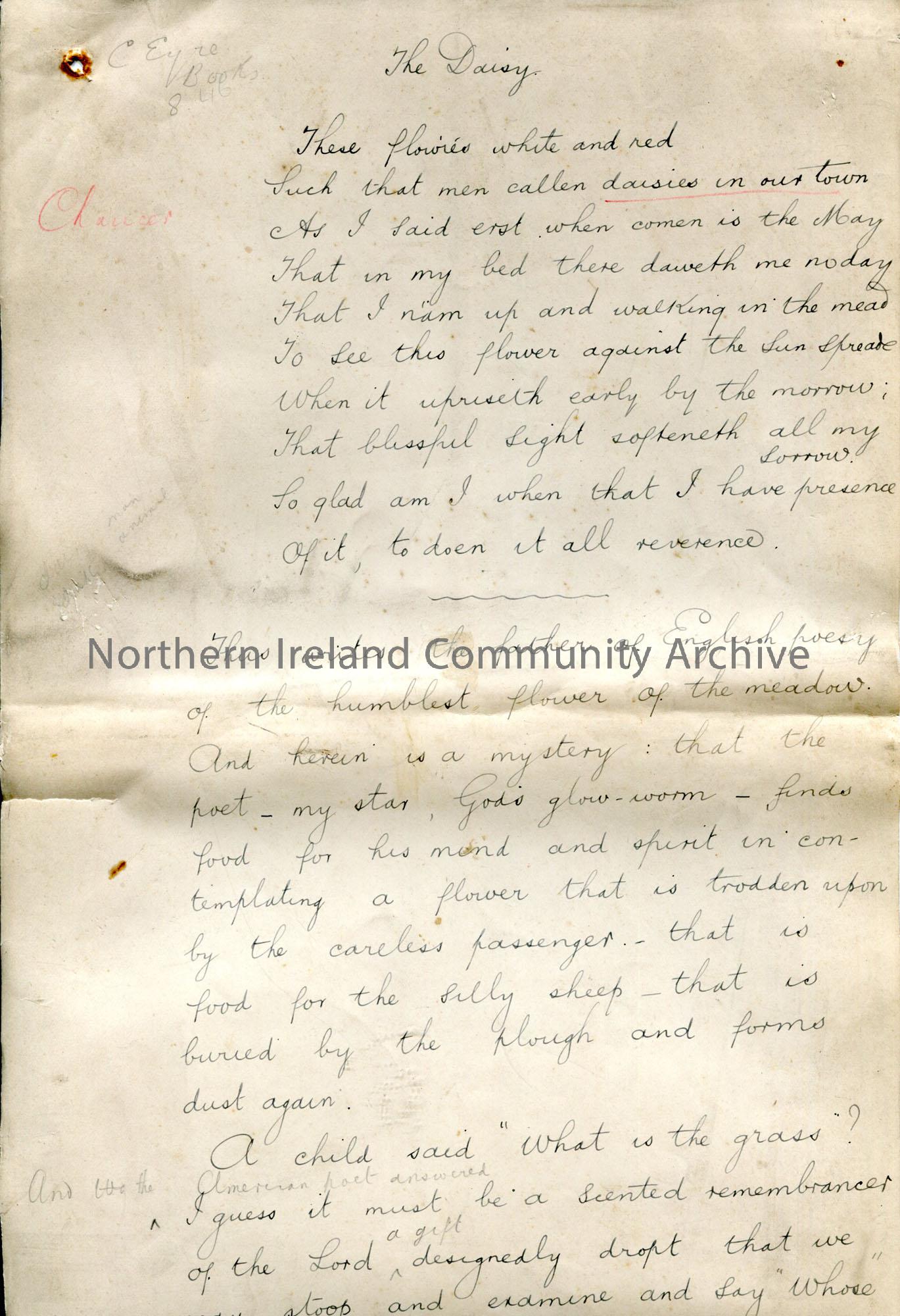 Page 1 of 33. Handwritten essay by Sam Henry titled, ‘The Daisy’. Re the flower. Pages not in order.