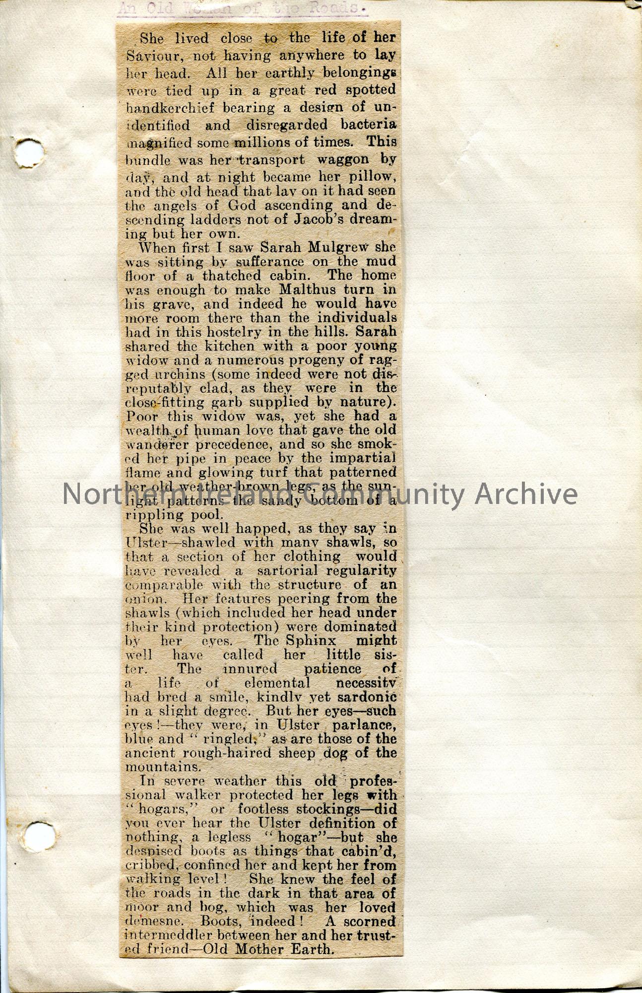 Page 1 of 4. Article cut from a newspaper titled, 'An Old Woman of the Roads' by Sam Henry. Re Sam's visit to widow Sarah Mulgrew. Described as an 'old professional walker' and 'Oul' Sarah by country people. Sam encouraged her to sing. Describes how she received her first pension.