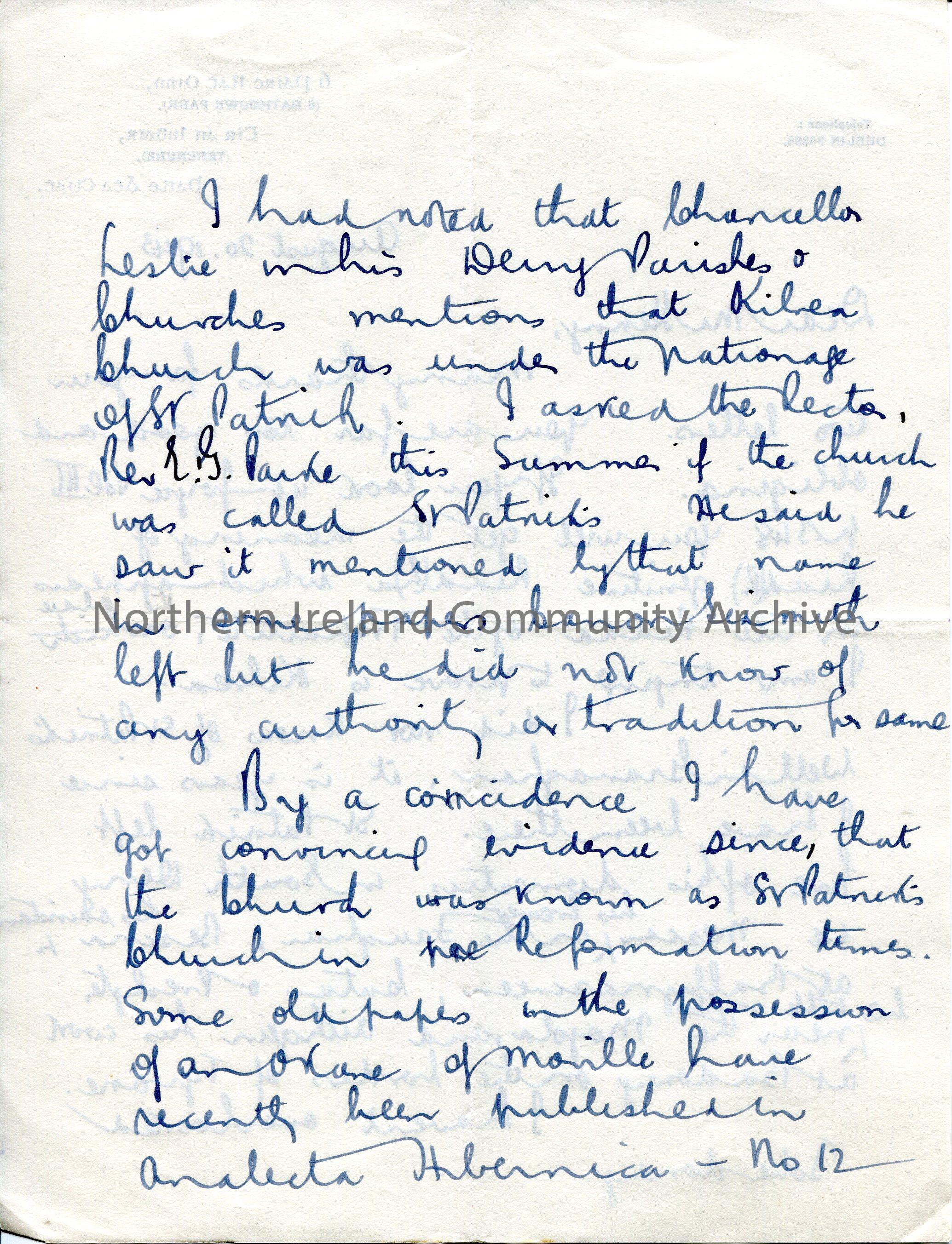 Page 1 of 4. Handwritten letter (double sided) to Sam Henry. Writes re St. Patrick and Kilrea Church. Mentions an old custom of driving cattle between… – scan087b