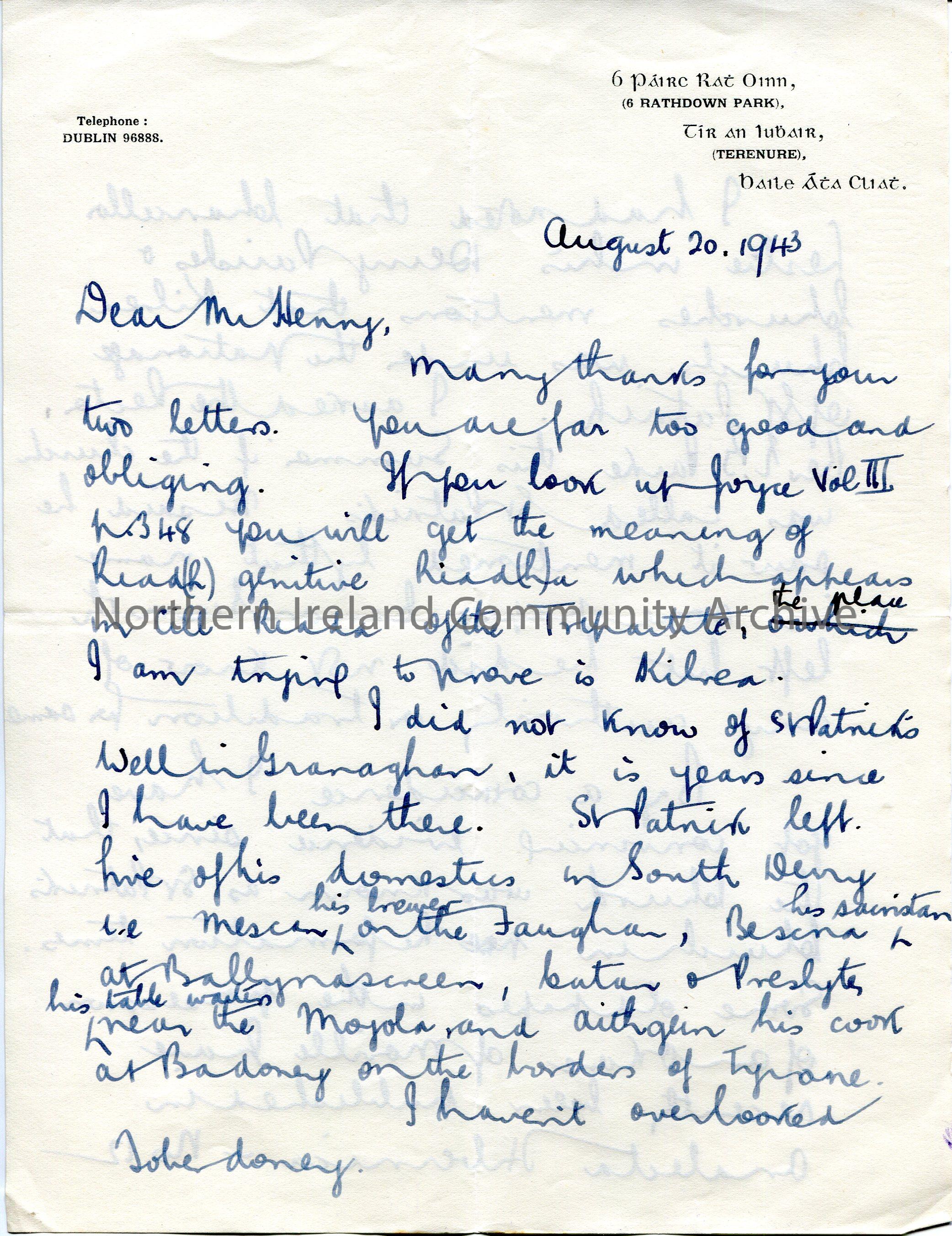 Page 1 of 4. Handwritten letter (double sided) to Sam Henry. Writes re St. Patrick and Kilrea Church. Mentions an old custom of driving cattle between…