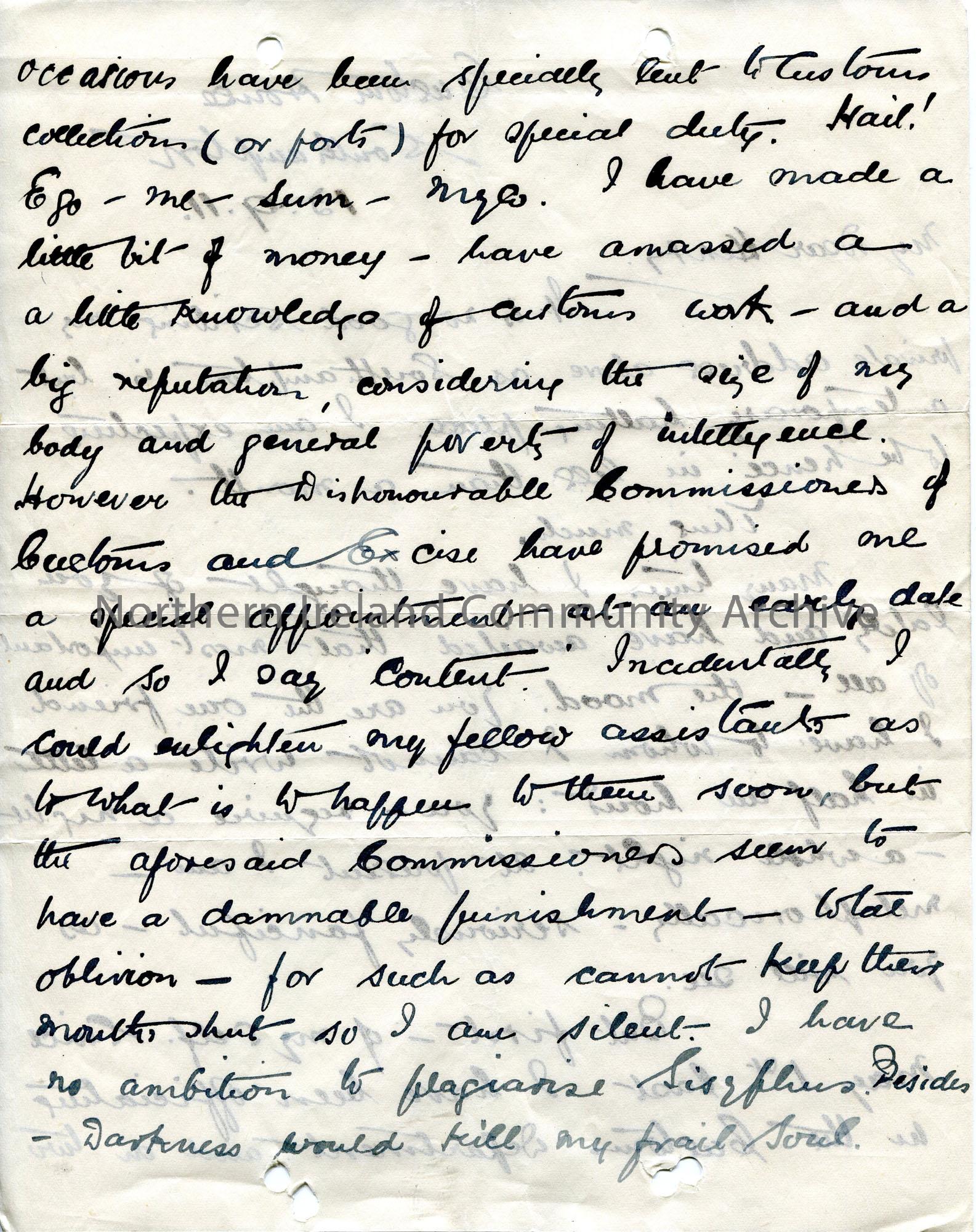 Page 1 of 4. Handwritten letter to Sam Henry. The author comes across as eccentric in their writing. Appear to work for Customs and Excise. Refers to … – scan044b