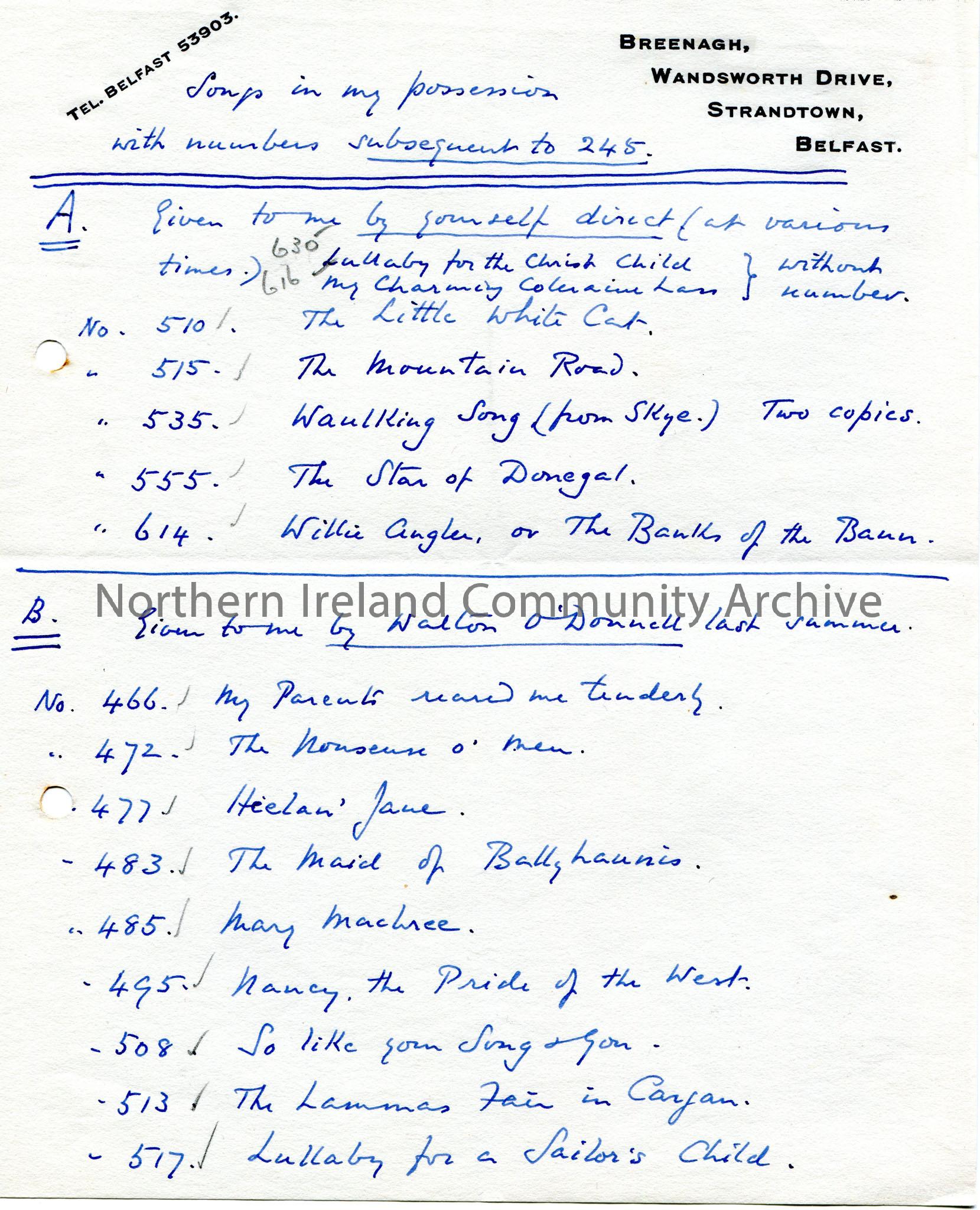 Page 1 of 4. Handwritten list of songs titled, 'Songs in my possession with number subsequent to 245'. Sections A and B. Songs in section A have been given by Sam Henry direct and section B by Walton O'Donnell last summer.