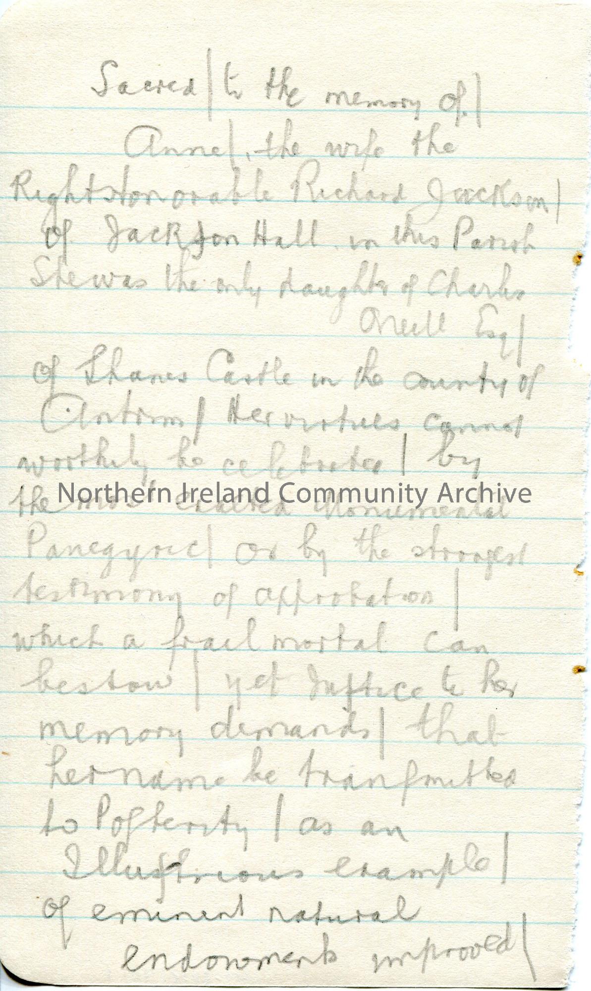 Page 1 of 4. Handwritten notes in pencil of the memorial of Anne Jackson, wife of Right Honourable Richard Jackson of Jackson Hall. Taken from Killowe…