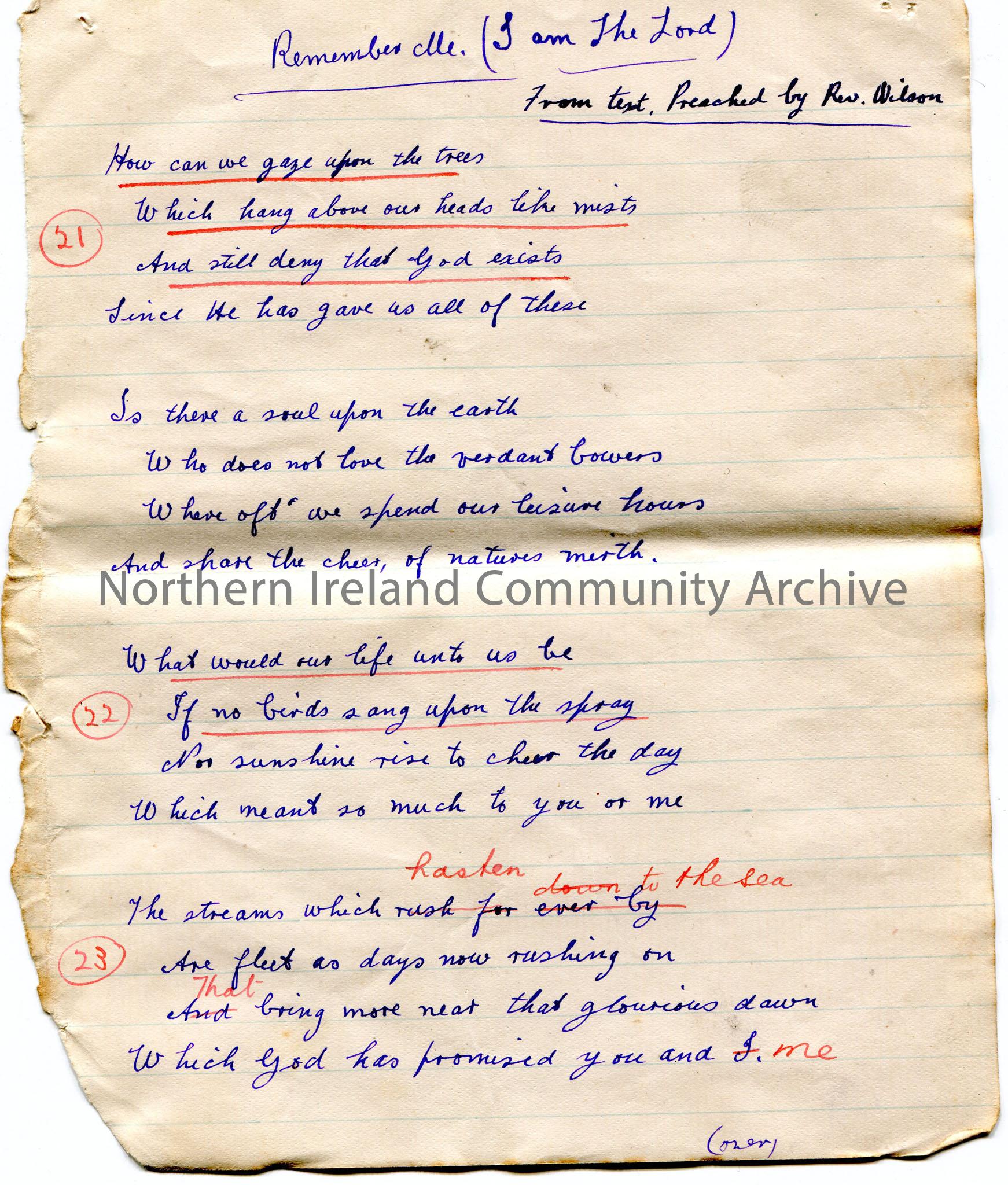 Page 1 of 4. Handwritten poem or words to song on lined paper titled, 'Remember Me. (I am the Lord)'. 'From text, Preached by Rev. Wilson'. Annotated in red ink. Some lines are underlined in red. Numbers '21' to '29' written beside some verses. Initialled D.P.