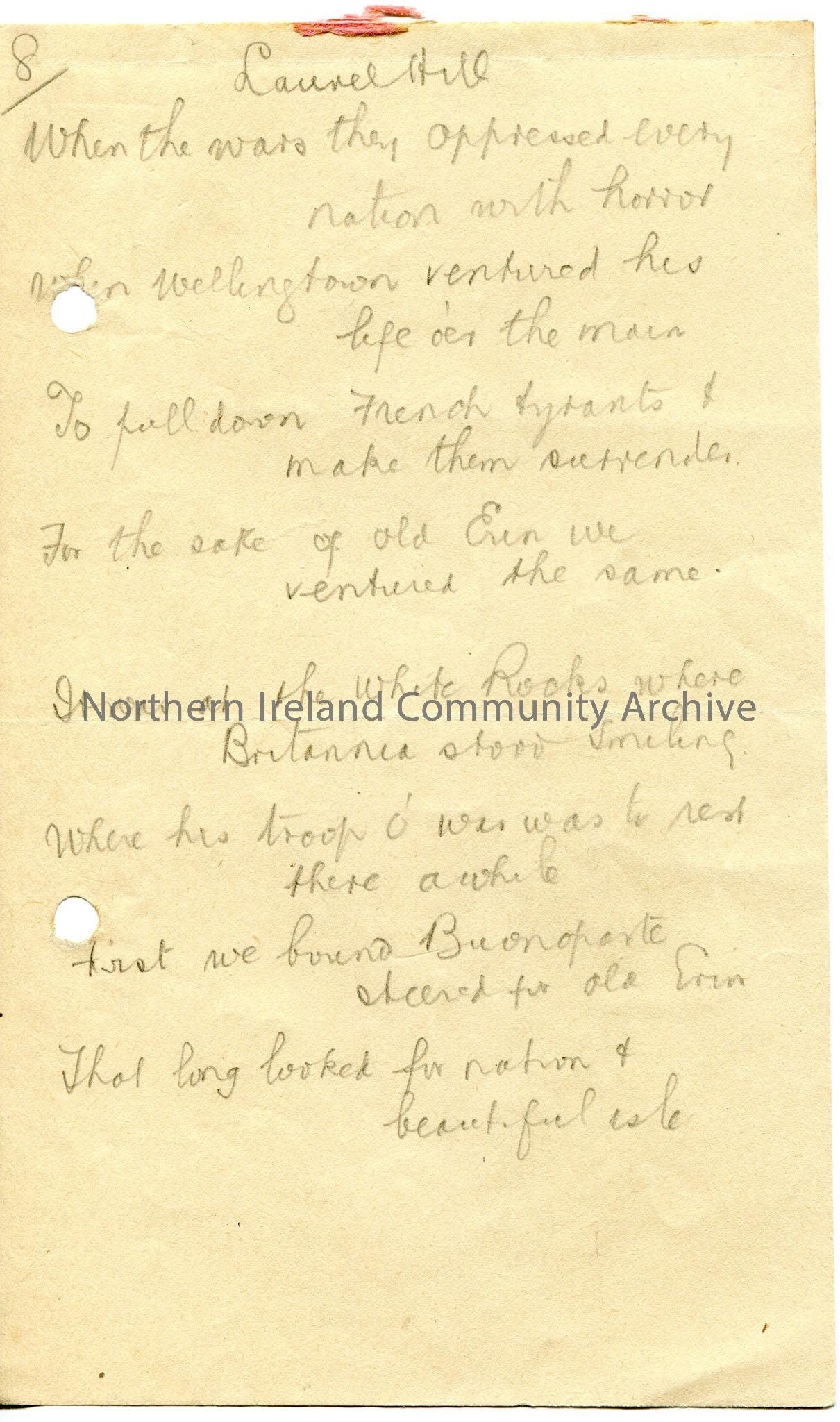 Page 1 of 4. Handwritten song or words to poem titled, ‘Laurel Hill’. Mentions Coleraine, White Rocks.