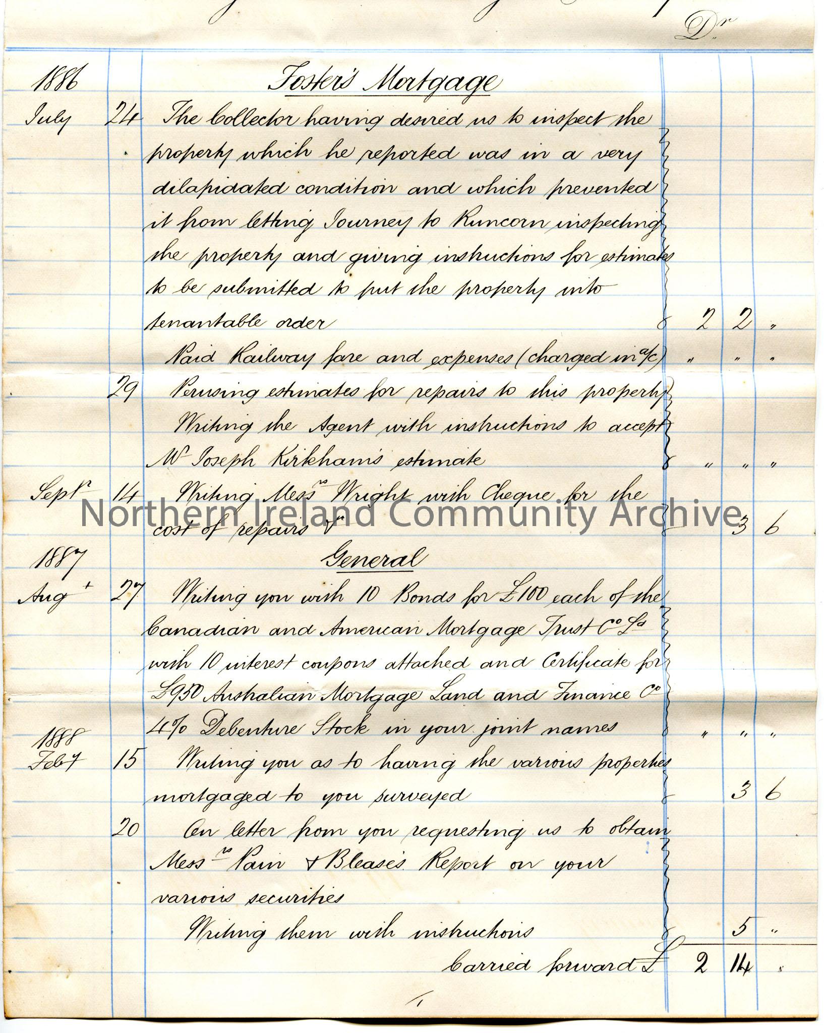 Page 1 of 4 of handwritten bill to Misses Hezlet. Details of costs for services re Foster's Mortgage and General. Dated from 24th July 1886 - 30th November 1888. Total of £7.10.2.