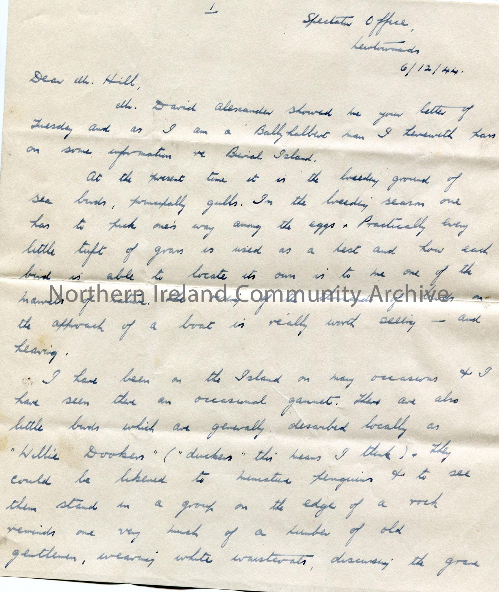 Page 1 of 4 of handwritten letter from H.McGuinness to Mr Hill. Addressed from Spectator Office, Newtownards. Writing with information re Burial Islan…