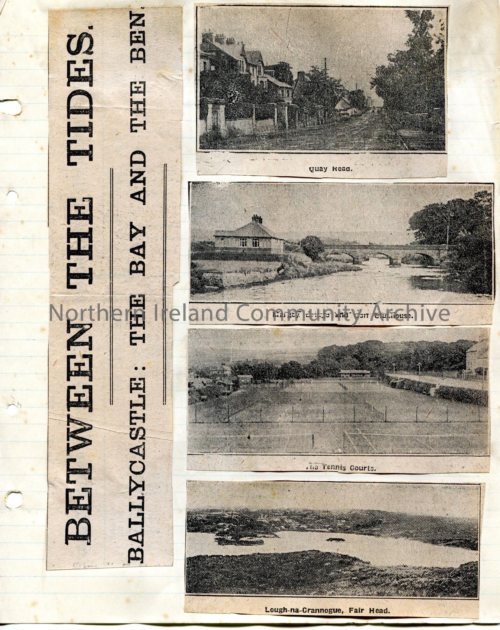 Page 1 of 4 of newspaper cuttings stuck to lined paper. Titled, 'Between the Tides. Ballycastle: The Bay and the Ben,' by Sam Henry. Re Rathlin and Ballycastle. Page 1 has 4 images captioned, 'Quay Road', 'Margey Bridge and Golf Clubhouse', 'The Tennis Courts', and 'Lough-na-Crannogue, Fair Head'. Page 4 photographic image is of two people standing at a stream or river captioned, 'In Glenmakeeran'.