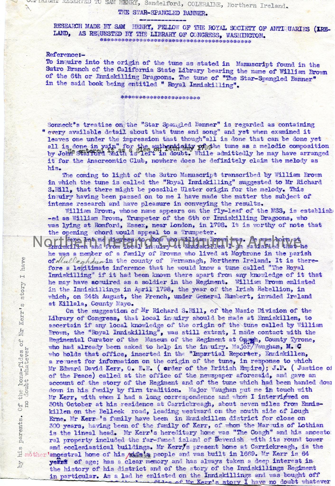 Page 1 of 4 of typed report. Annotated carbon copy of research requested by the Library of Congress, Washington re origin of the song 'Star Spangled Banner' 'as stated in Manuscript found in the Sutro Branch of the California State Library bearing the name of William Brown of the 6th or Inniskilling Dragoons'.