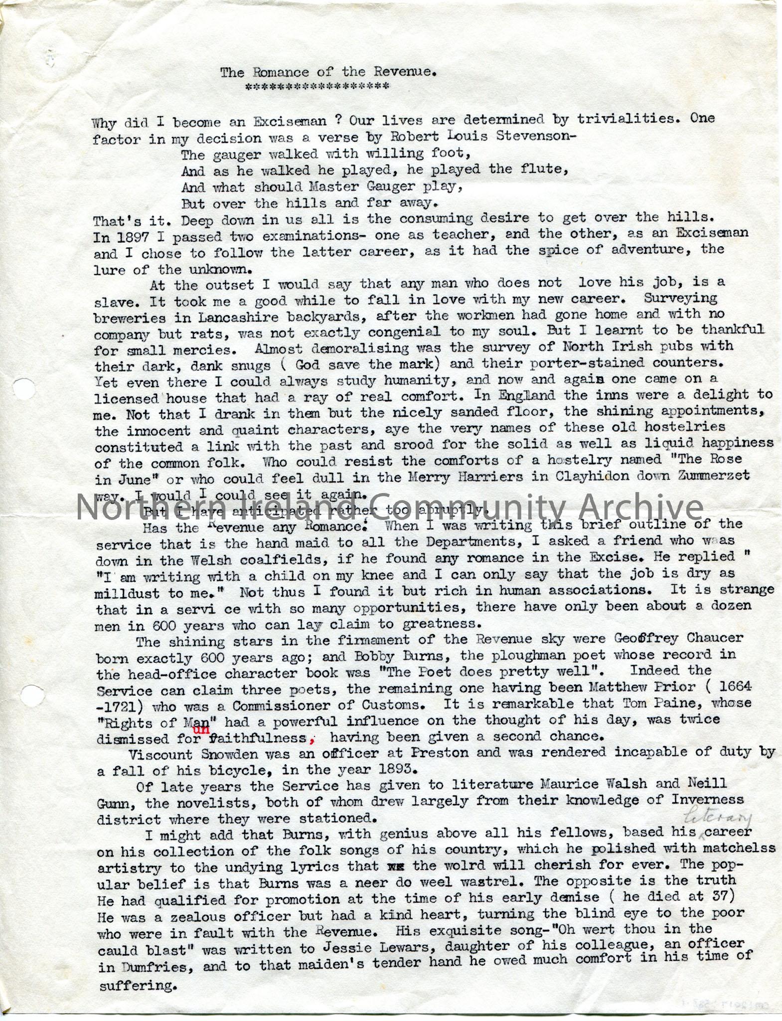 Page 1 of 4 of typed script for broadcast titled, 'The Romance of the Revenue'. Sam explores the reasons for becoming an Exciseman and discusses the 'romance' of the occupation.
